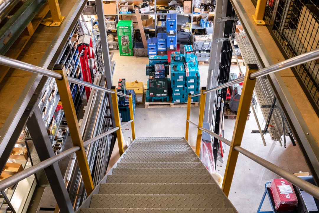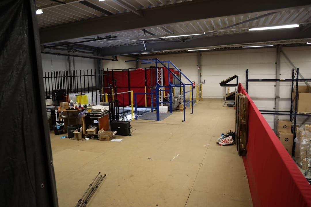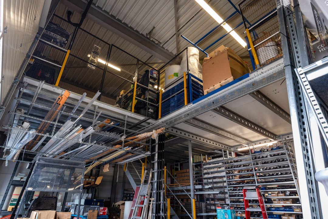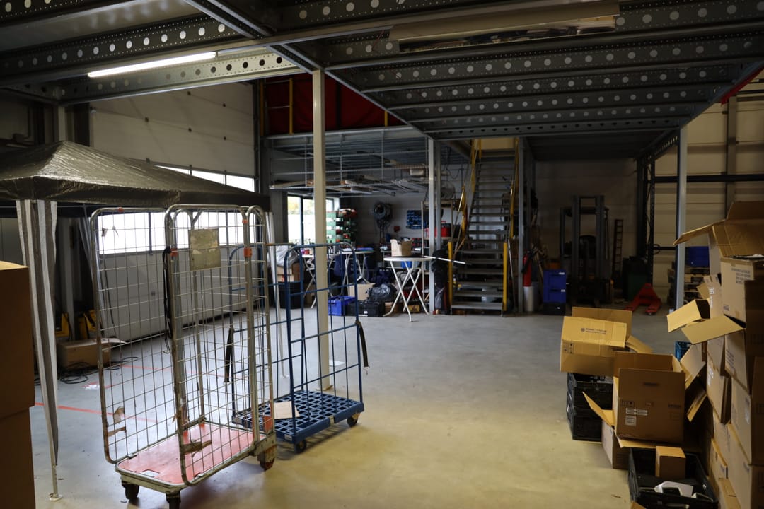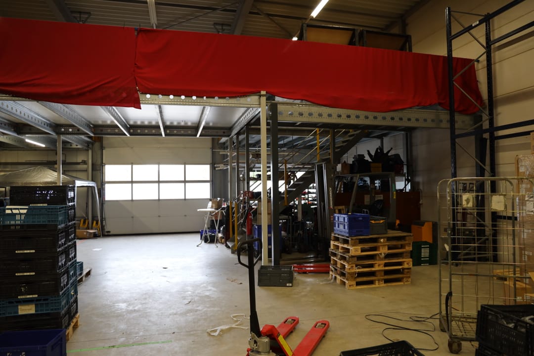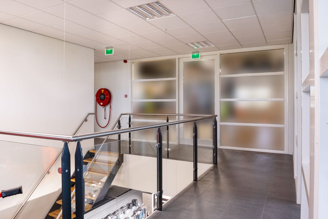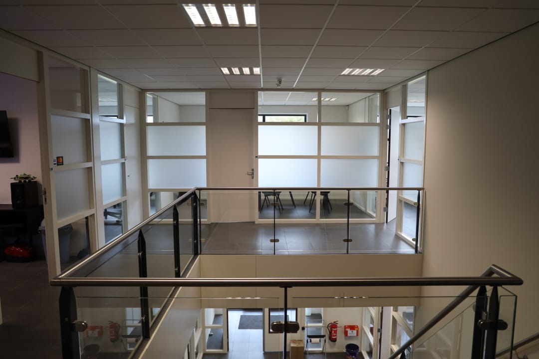 Eerste verdieping: ruime overloop vide met toegang naar diverse kantoorkamers en een schuifdeur naar de entresolvloer in de bedrijfshal van tevens 250 m² met een hoogte van 3,8 meter. De verdiepingsvloer in de bedrijfshal heeft een draagvermogen van 1.000 kg/m².