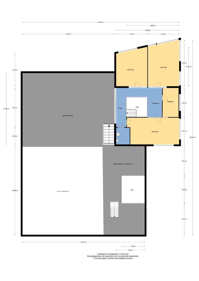 De bedrijfsruimte kent een vrije hoogte van circa 4,20 meter en een gedeelte zelfs 7,50 meter waardoor er veel soorten bedrijvigheid mogelijk zijn op de locatie. Alle kantoorkamers zijn voorzien van een groot aantal raampartijen waardoor er een mooi panoramabeeld ontstaat vanuit de kantoren. Een prachtig gezicht, u zult hier heerlijk kunnen werken!