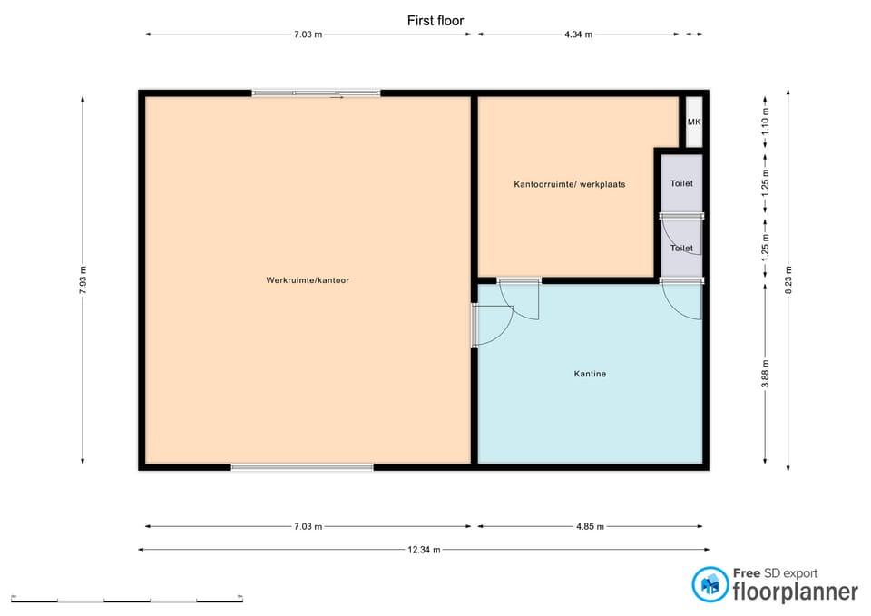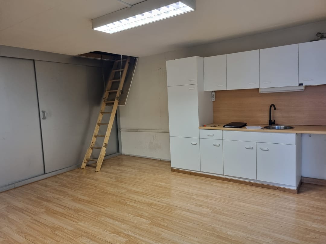 • Begane grond: ruime werk-/opslagruimte (ca. 55 m2), kantine/keuken (ca. 20 m2), kantoorruimte (ca. 16 m2) en een toiletruimte met portaal.