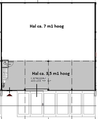 •circa 303 m² BVO bedrijfsruimte (ca. 200 m² hal heeft een vrije hoogte van 7 meter, de overige ca. 100 m² hal ligt onder de kantoorruimte en kent een hoogte van ca. 3,5 m¹);
