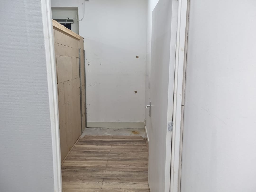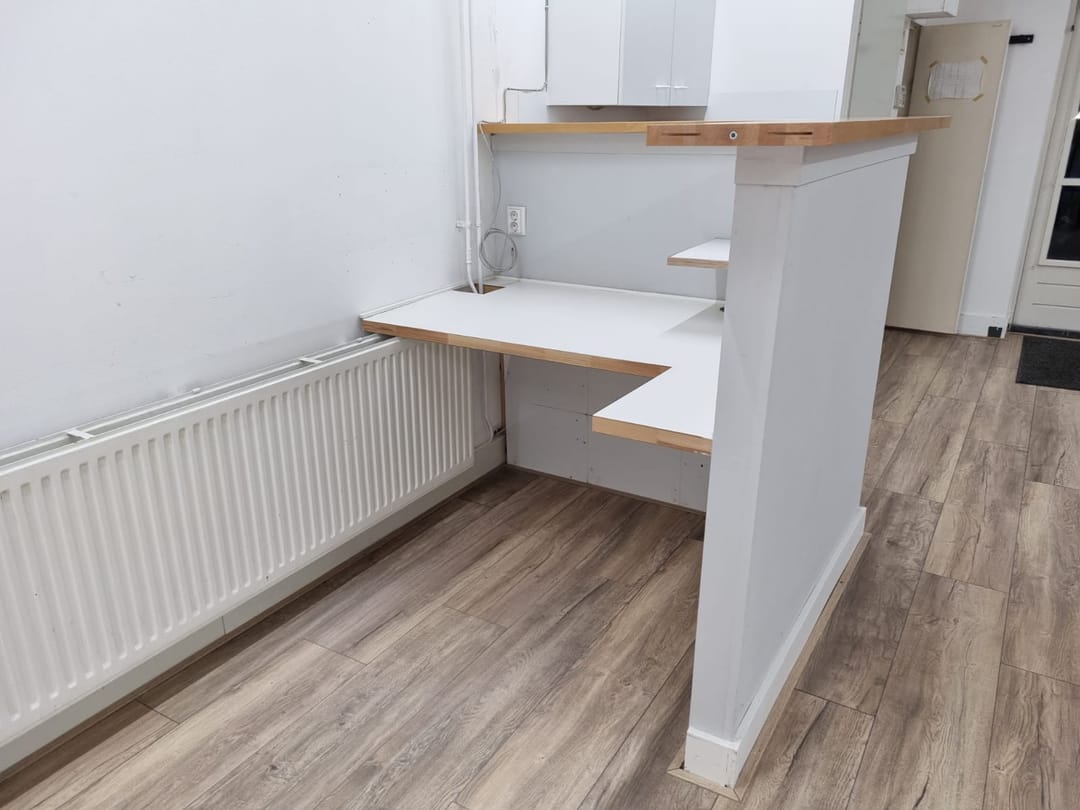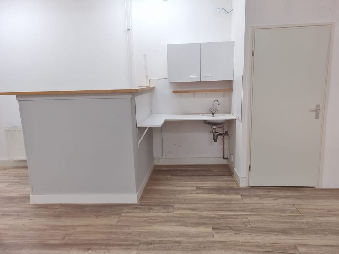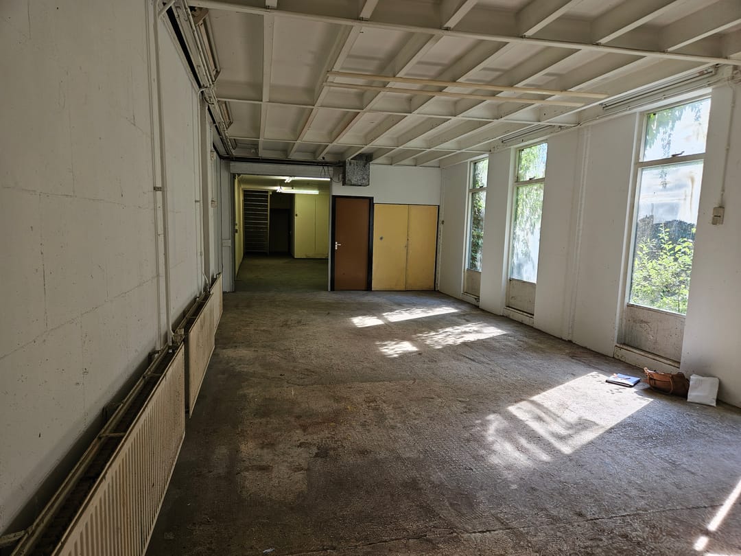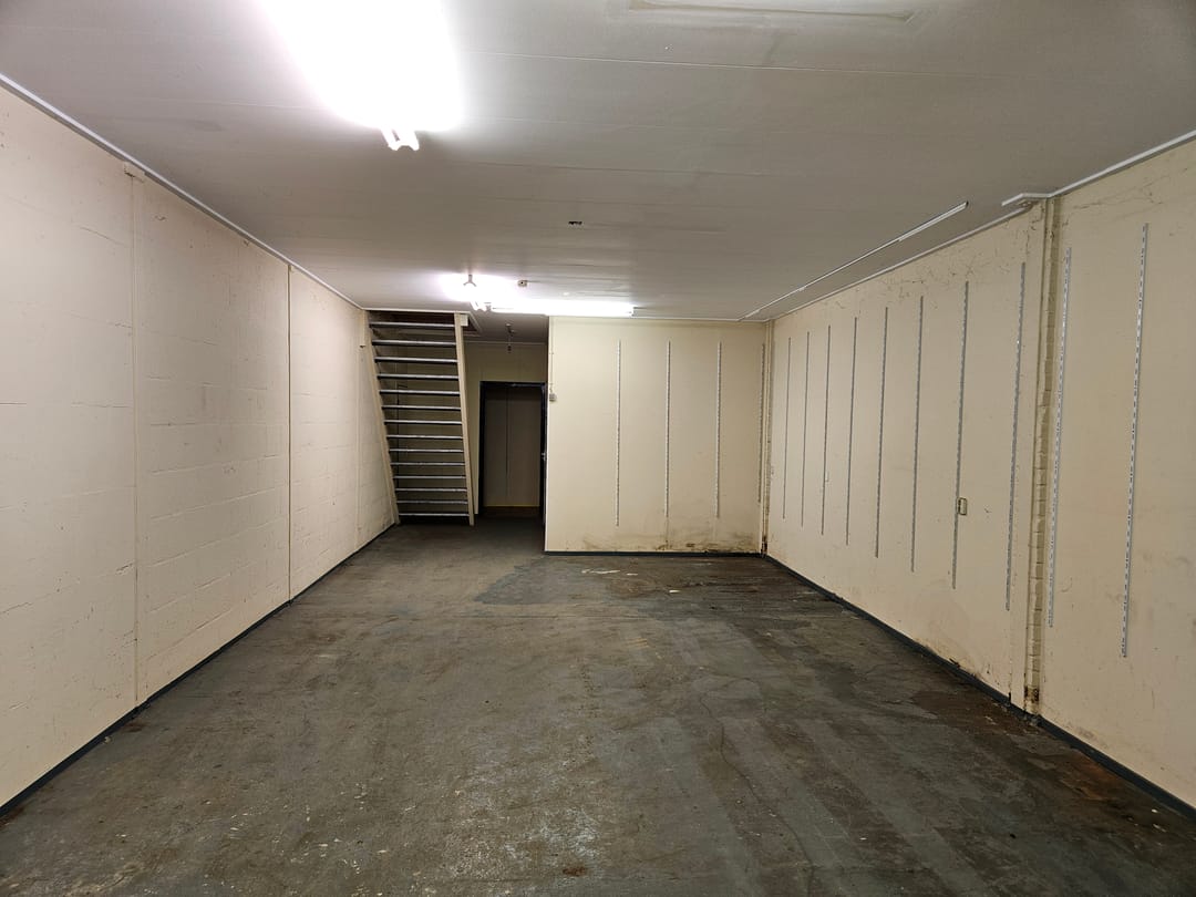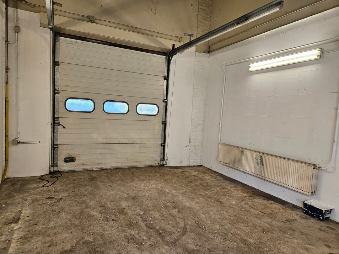 Achter een scheidingswand bevindt zich bovendien ruime opbergruimte, wat het pand geschikt maakt voor uiteenlopende doeleinden, zoals kantoor, atelier of kleine werkplaats.