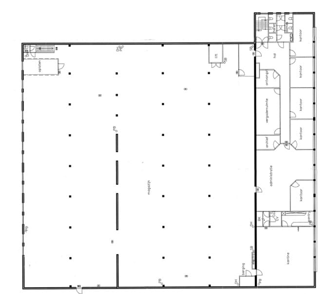 - twee inpandige bedrijfskantoren met systeemplafond en TL inbouw verlichtingsarmaturen; noodverlichtingsinstallatie;