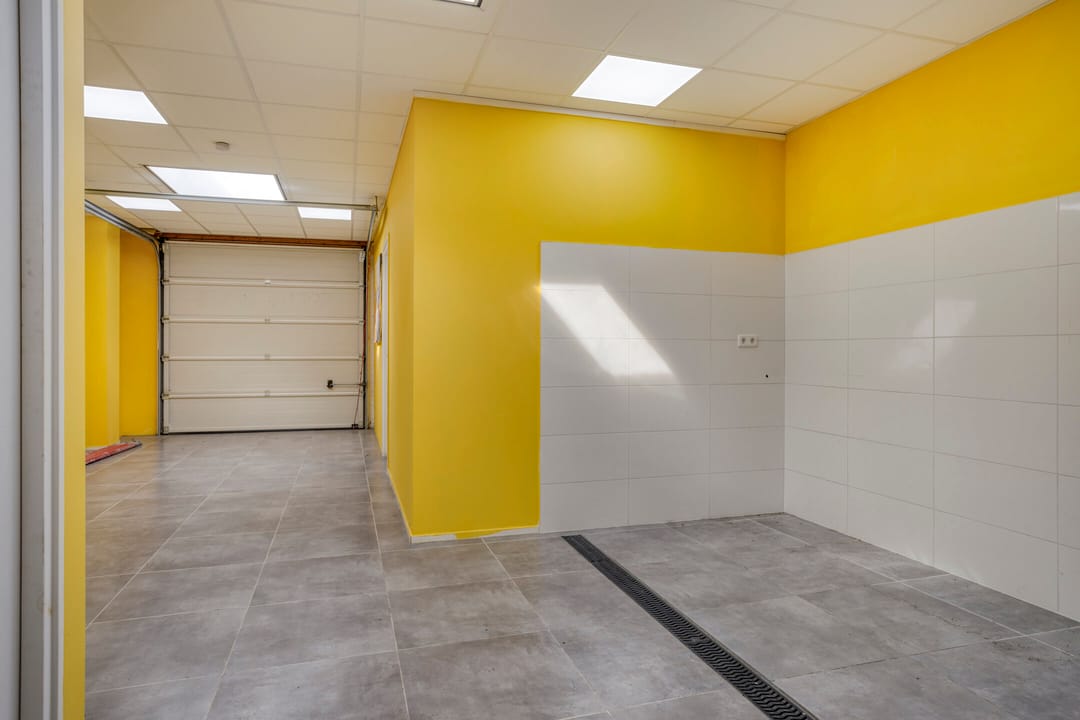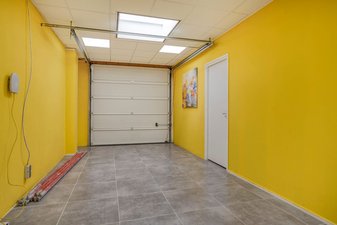 The property features a wide overhead door, making loading and unloading easy. Inside, there are several rooms, and the layout can easily be adjusted to suit your needs. This makes the space highly flexible, whether for work or storage.