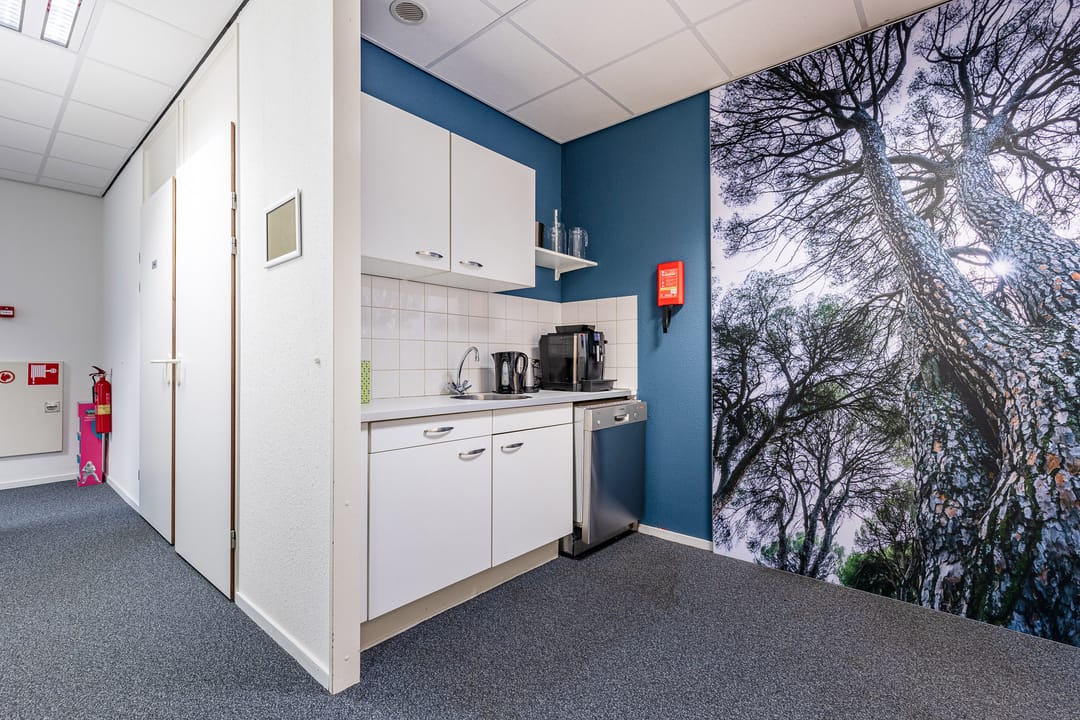 De ruimte is afgewerkt met vloerstoffering en voorzien van brandblusvoorzieningen. Tevens zijn er gescheiden dames- en herentoiletten met voorportaal en fonteintje, een pantry en een verwarmingssysteem middels een CV-installatie met radiatoren en thermostaatkranen. Verder is er een intercominstallatie en slagboominstallatie aanwezig.