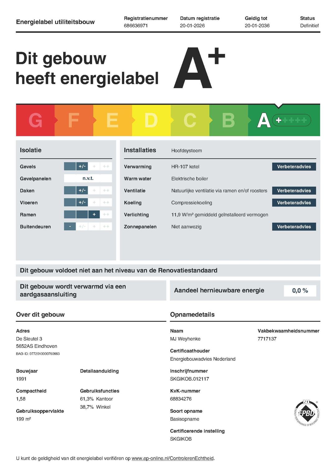 De kantoorruimte beschikt over het zeer gunstige energielabel A+ welke geldig is tot 20-01-2036.