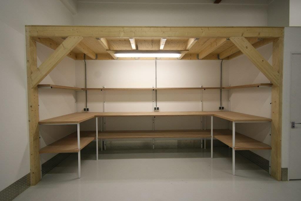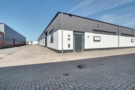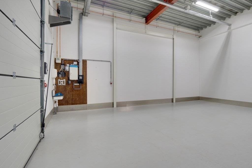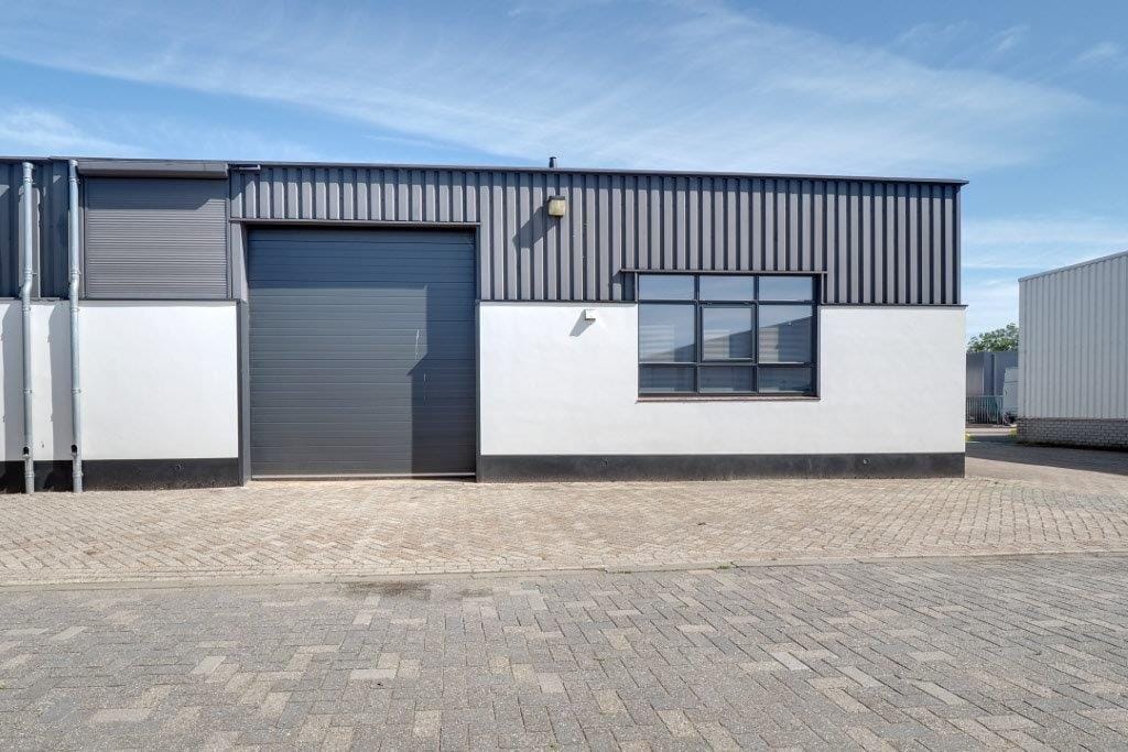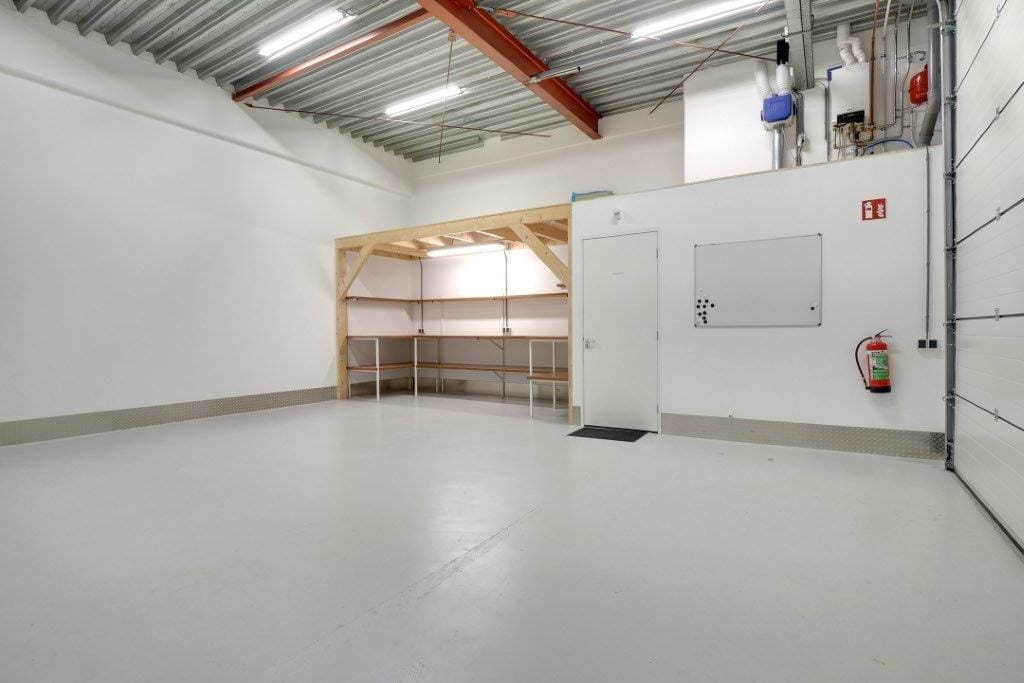 Bedrijfshal: gestorte betonnen vloer met vloercoating, elektrisch bedienbare overheaddeur, energiezuinige TL-verlichting, entresolvloer, werkbank met schappen, wasgelegenheid, stroomvoorziening 3 x 25 ampère, 1 x krachtstroom aansluiting.