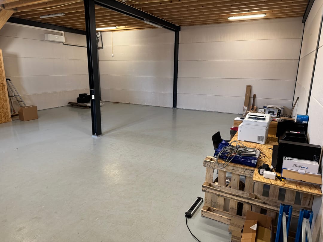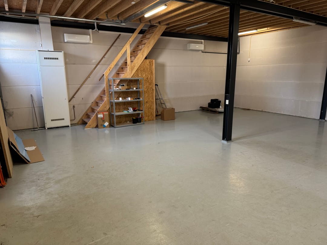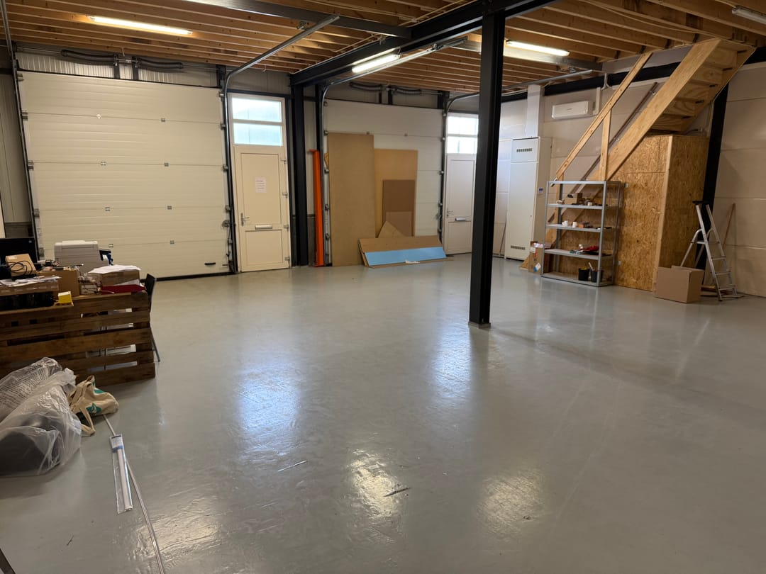 Entree via 2-tal loopdeuren en 2-tal overheaddeuren met directe toegang tot de 110 m² grote bedrijfsruimte. De vrije hoogte in de bedrijfshal is 3.50 m¹ en de gehele vloer is grijs gecoat en voorzien van verlichting en diverse stopcontacten.