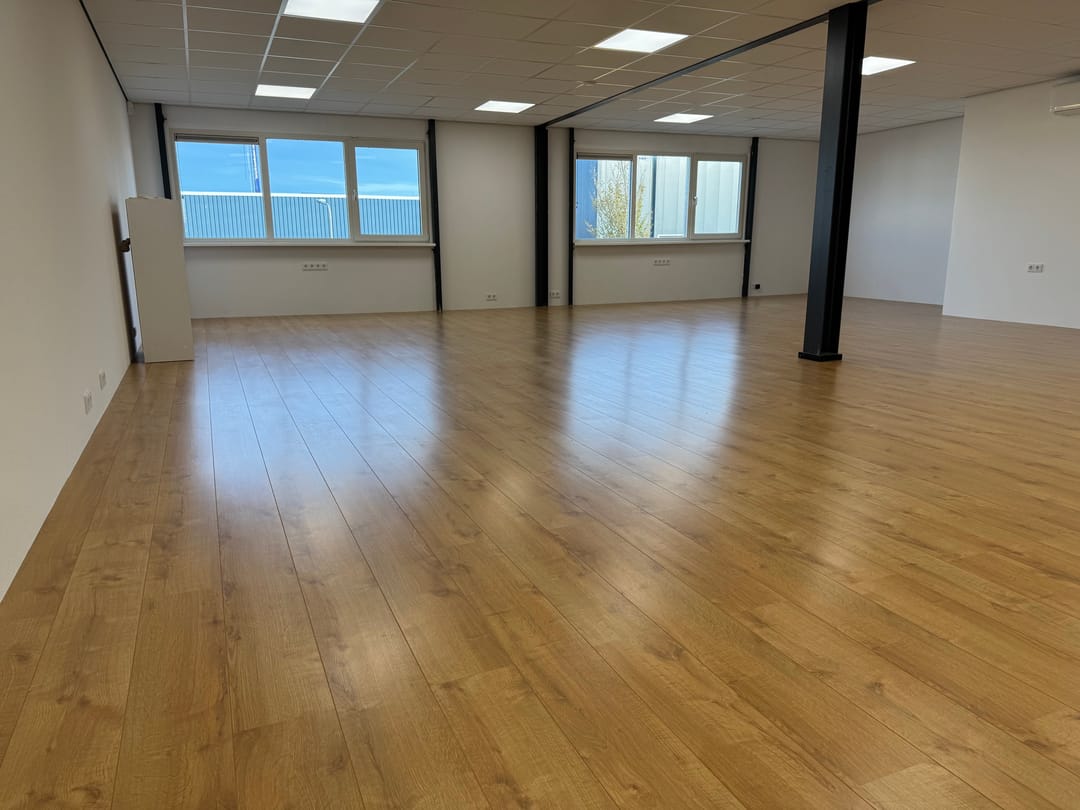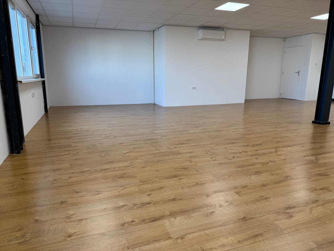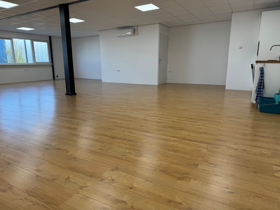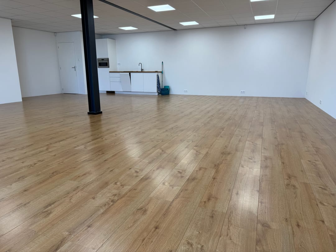 Op de 1e verdieping: thans 1 open ruimte van 110 m² voorzien van toiletruimte en luxe keuken voor zien van diverse inbouwapparatuur (waaronder oven en vaatwasser). De gehele ruimte is voorzien van systeemplafond + verlichting en eigentijdse vloerafwerking.