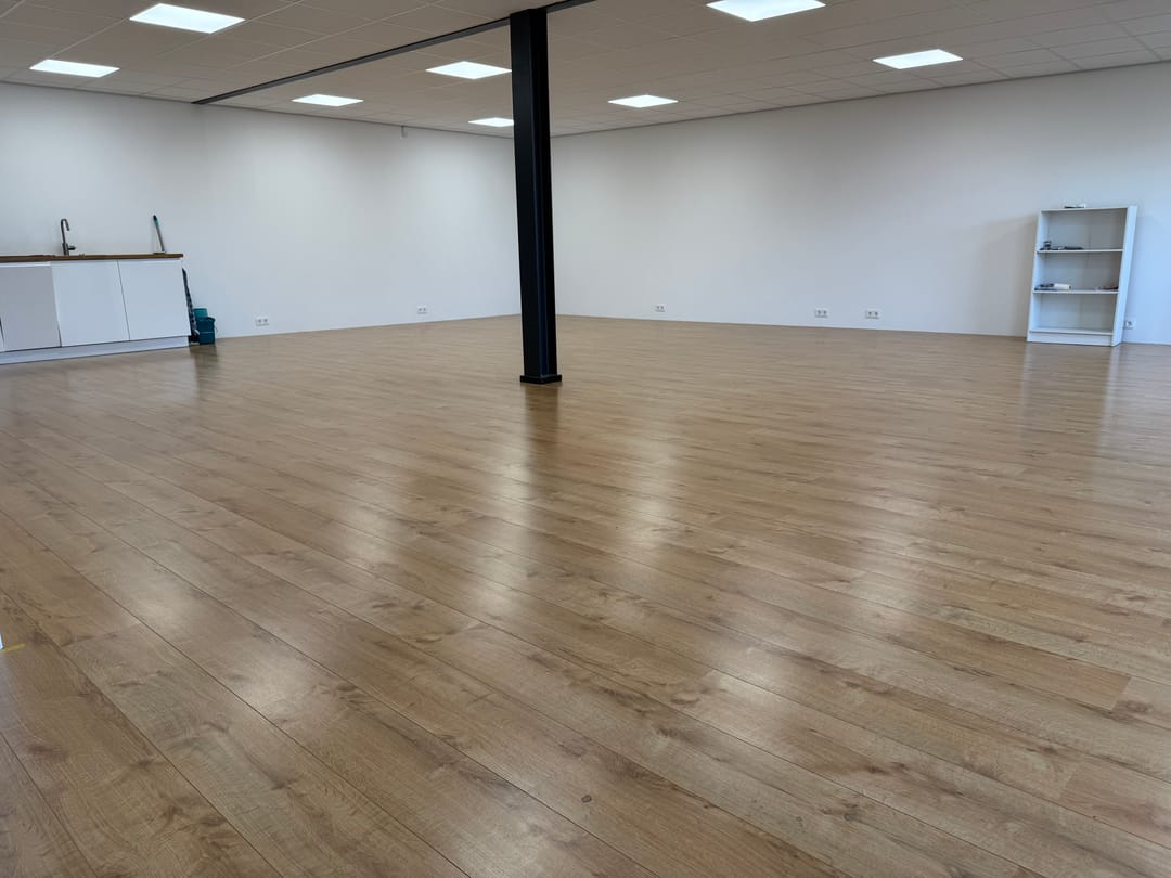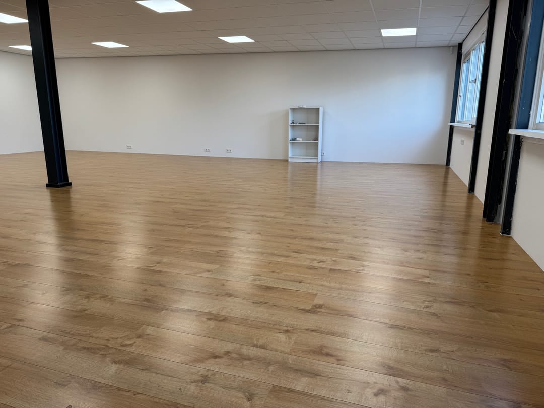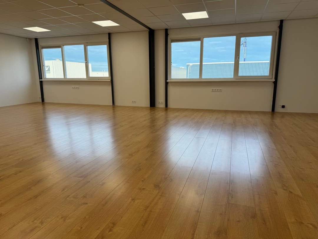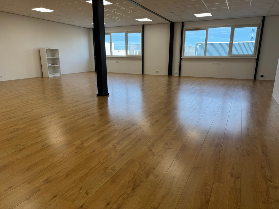Op de 1e verdieping: thans 1 open ruimte van 110 m² voorzien van toiletruimte en luxe keuken voor zien van diverse inbouwapparatuur (waaronder oven en vaatwasser). De gehele ruimte is voorzien van systeemplafond + verlichting en eigentijdse vloerafwerking.