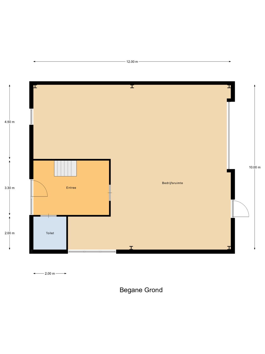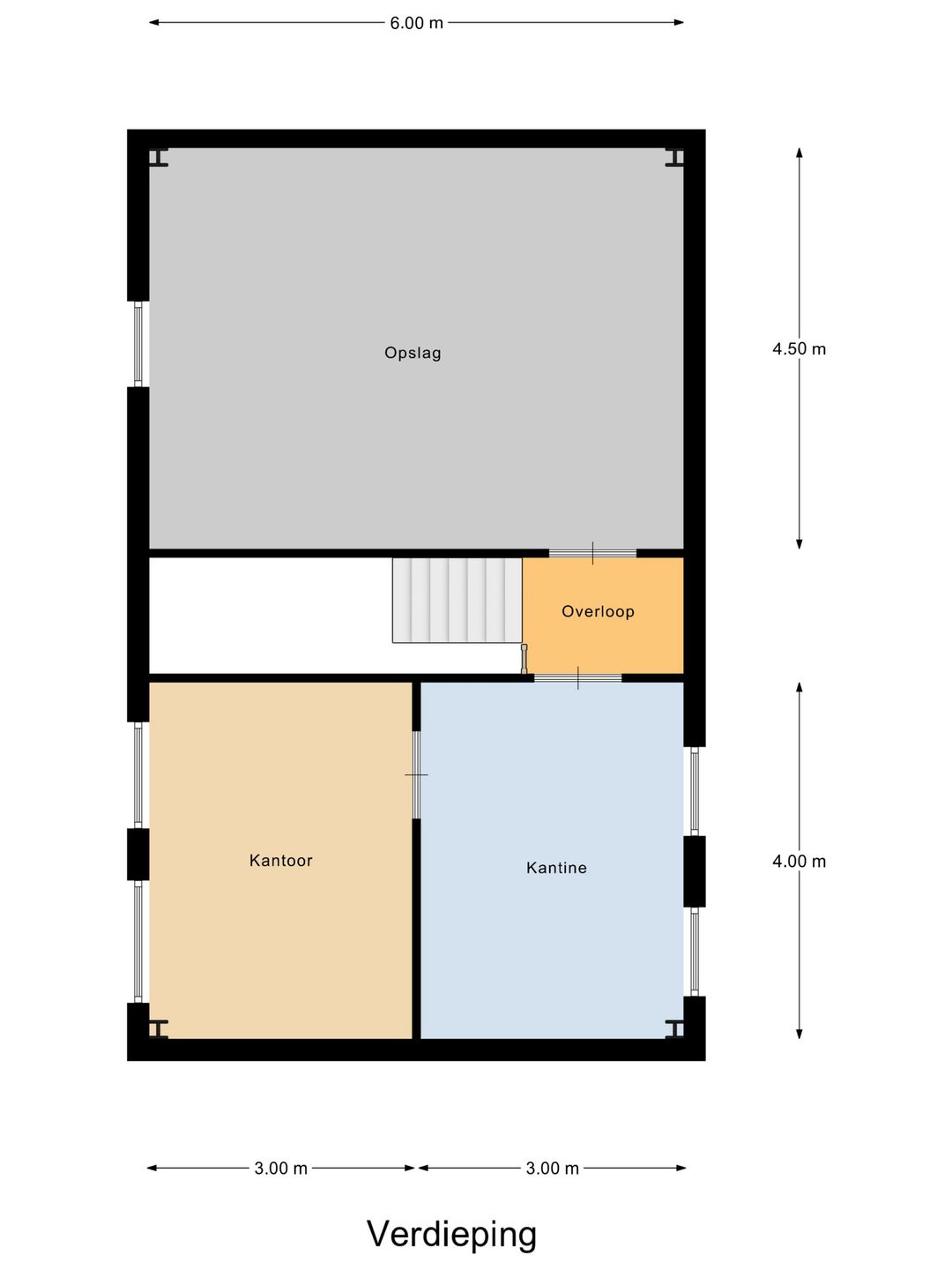 • Bedrijfsruimte begane grond (laag): ca. 38 m² (ca. 4 x ca. 2 m. en ca. 4,5 x ca. 6 m.)