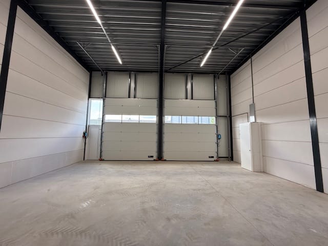 – Twee elektrisch bedienbare, geïsoleerde overheaddeuren met een separate loopdeur (tegen meerprijs met afstandsbediening);