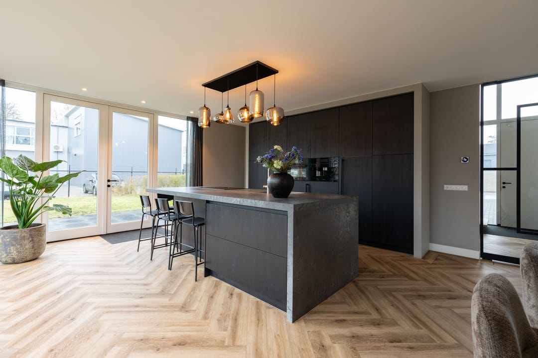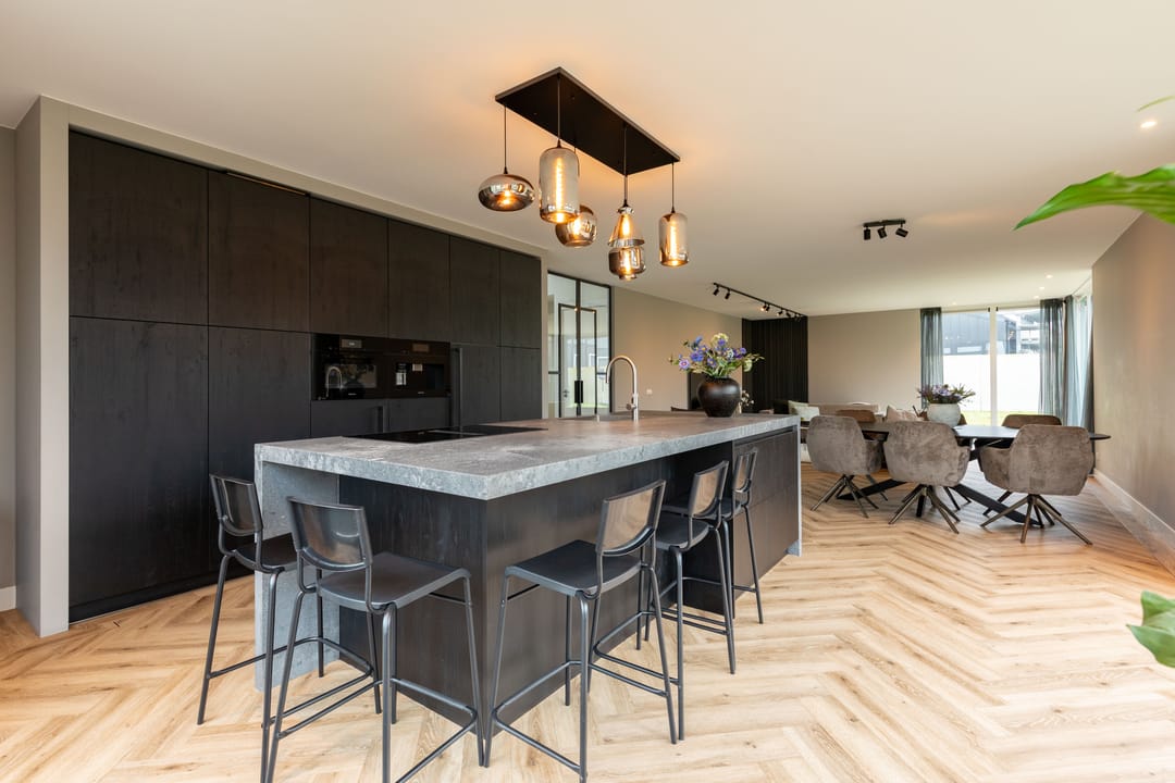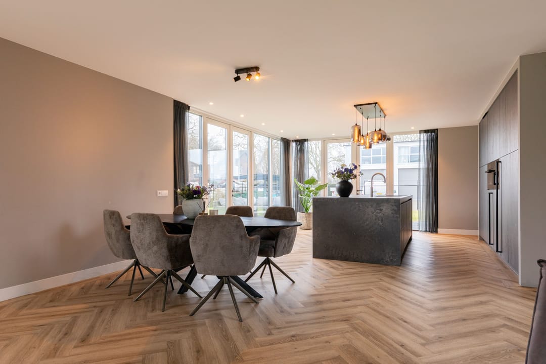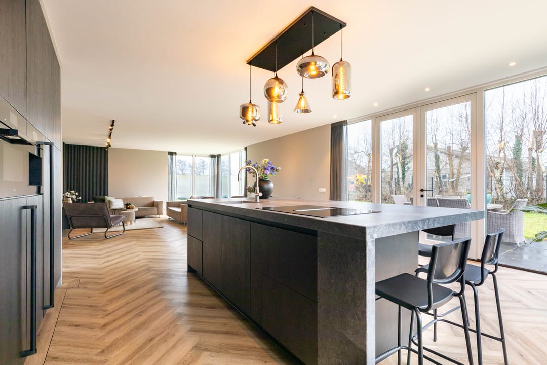 Het hart van de woning wordt gevormd door de royale woonkamer met open keuken en kookeiland. De keuken is voorzien van luxe inbouwapperatuur van Miele met o.a. een 5 pits inductieplaat, een koffiemachine, een combi-oven en een koel-/vriescombinatie. De Quooker en vaatwasser ontbreekt uiteraard niet. Dankzij de grote raampartijen profiteert u hier van een prachtige lichtinval en een ruimtelijk gevoel.