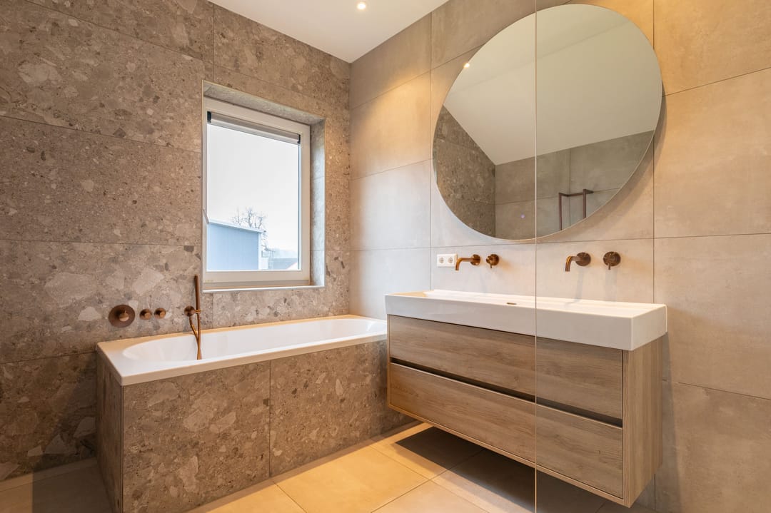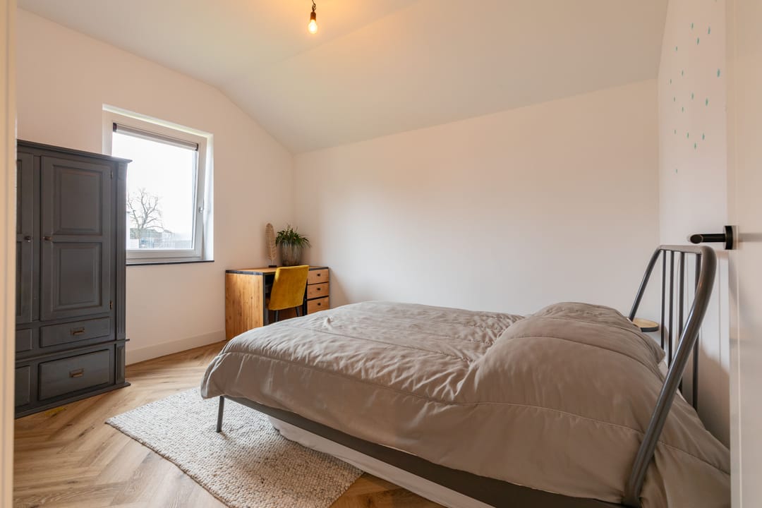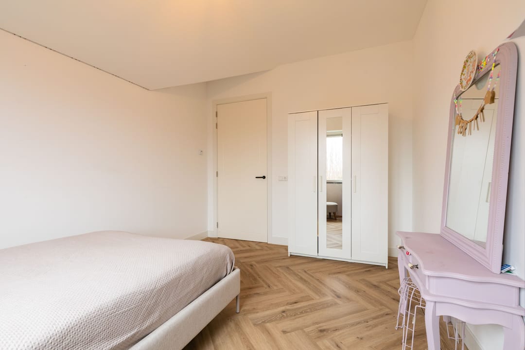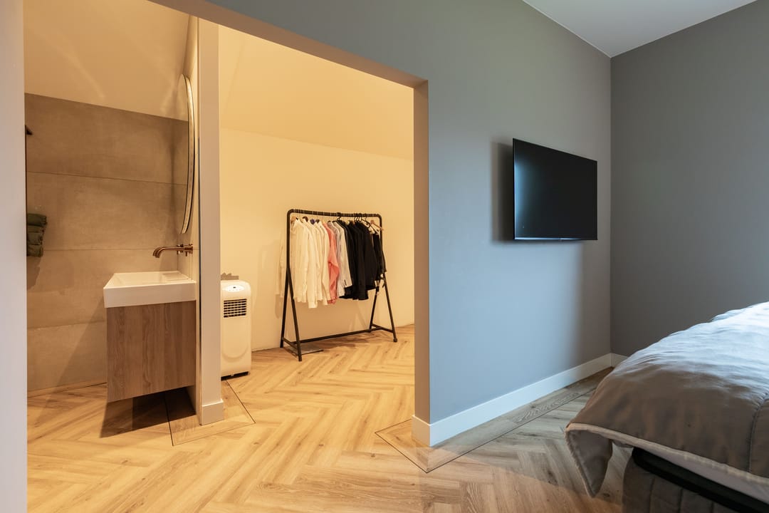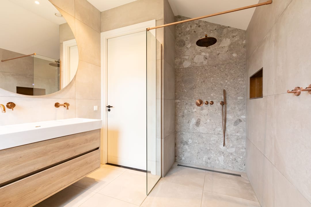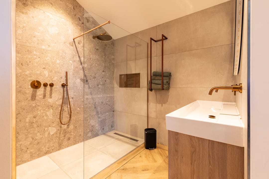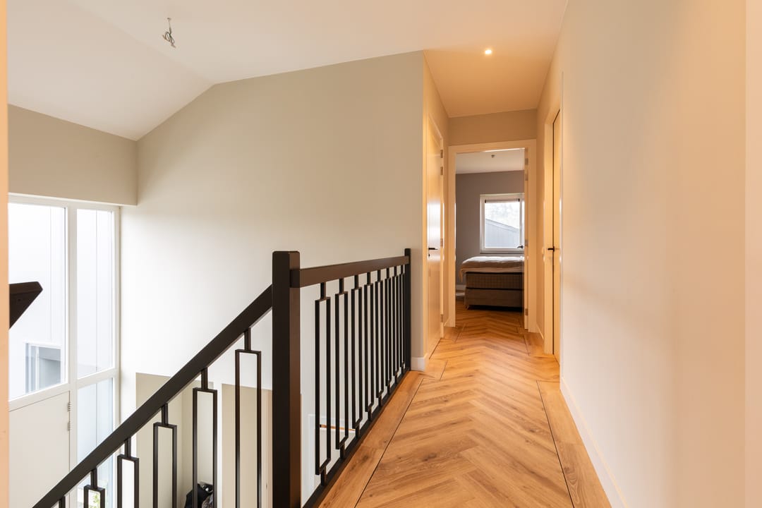 Op de eerste verdieping bevinden zich vier slaapkamers. De hoofdslaapkamer beschikt over een eigen badkamer met douche. Daarnaast is er een tweede, separate badkamer voor de overige slaapkamers met douche en ligbad. Beide badkamers zijn modern en luxe uitgevoerd met materialen van eikenhout, natuurstenen elementen en bronskleurige kranen. Op de overloop bevindt zich bovendien een apart toilet.