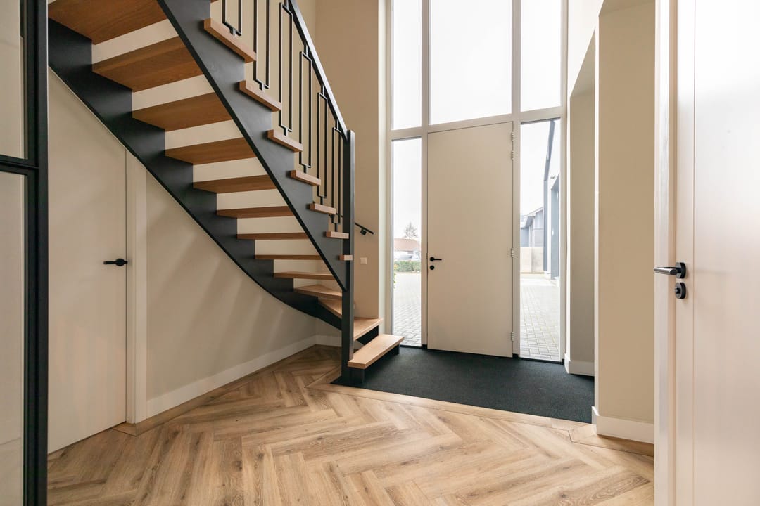 Bij binnenkomst in de ruime hal zie je direct de luxe en modern afgewerkte trap passend bij de uitstraling van de woning. Via de hal loop je door de prachtige stalen taats deuren naar de woonkamer en open keuken. Op de begane grond bevindt zich tevens een praktische wasruimte en een aparte kantoorruimte.