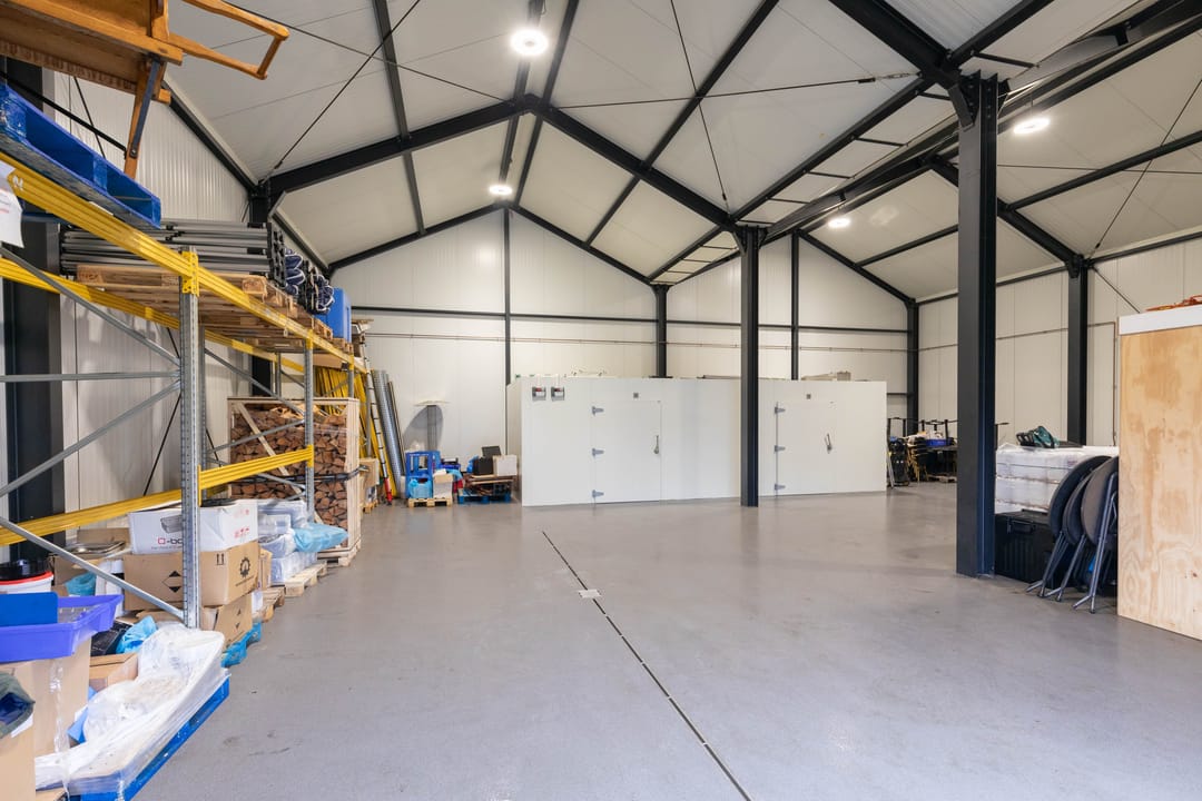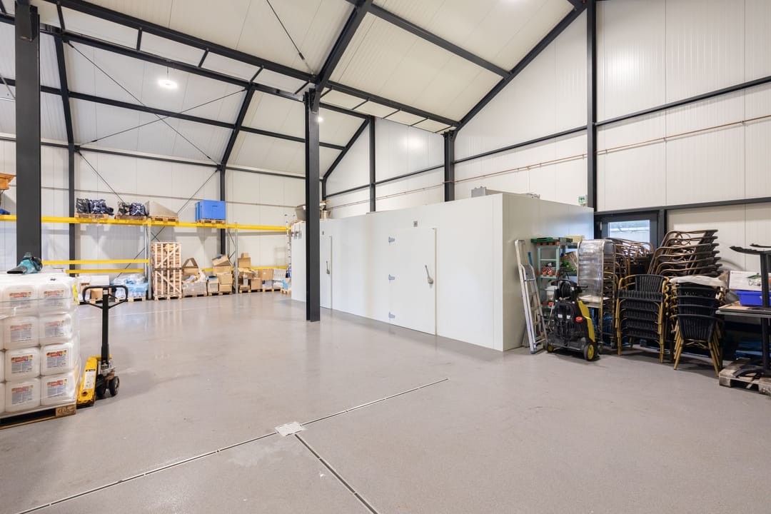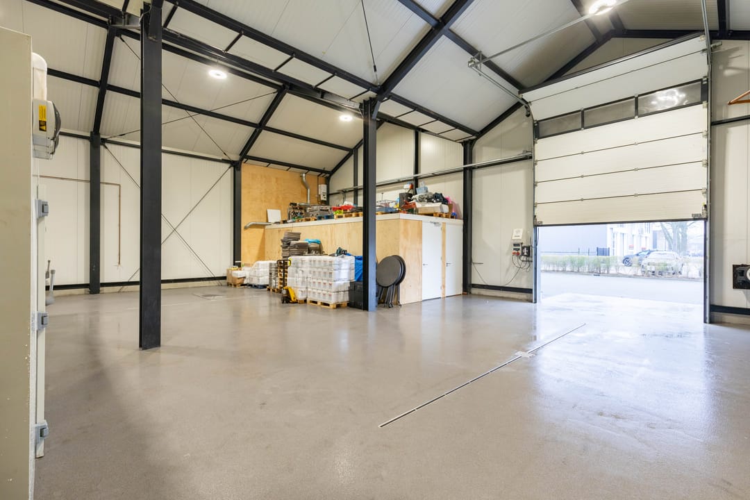 Direct aangebouwd aan de woning bevindt zich de ruime bedrijfsruimte van ca. 230 m² met een vrije hoogte van 5,25 tot 7,10 m. Deze ruimte is voorzien van een grote overheaddeur met een inrijhoogte van ca. 4,20 m en een breedte van ca. 3,50 m.