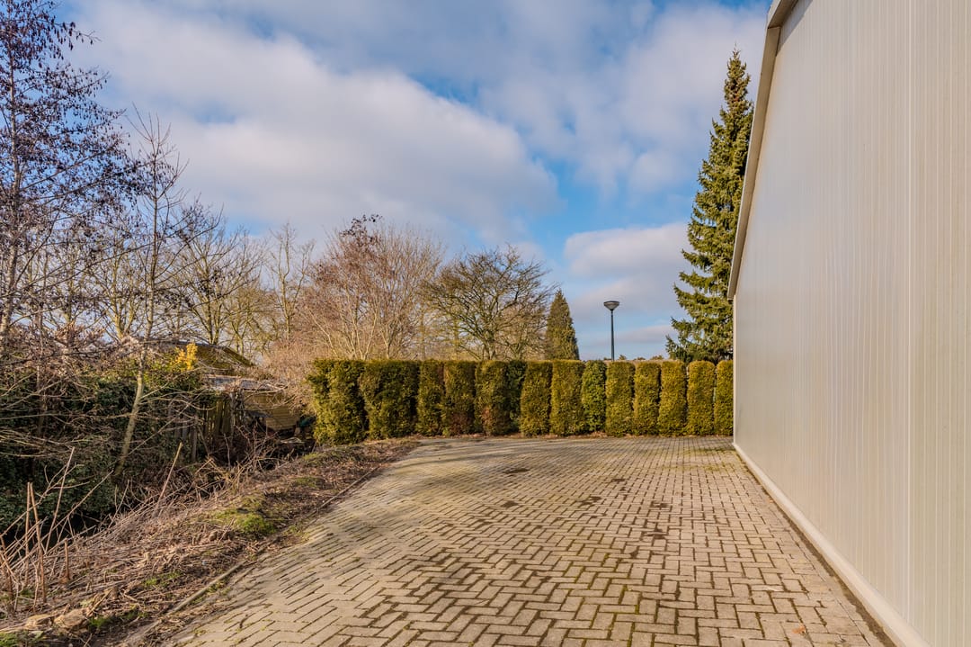 Het pad aan de rechterzijde, leidend naar de achterzijde (voor bijv. extra opslagruimte) van het perceel, is ca. 300/325cm breed.