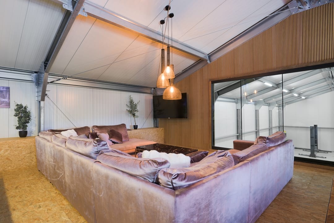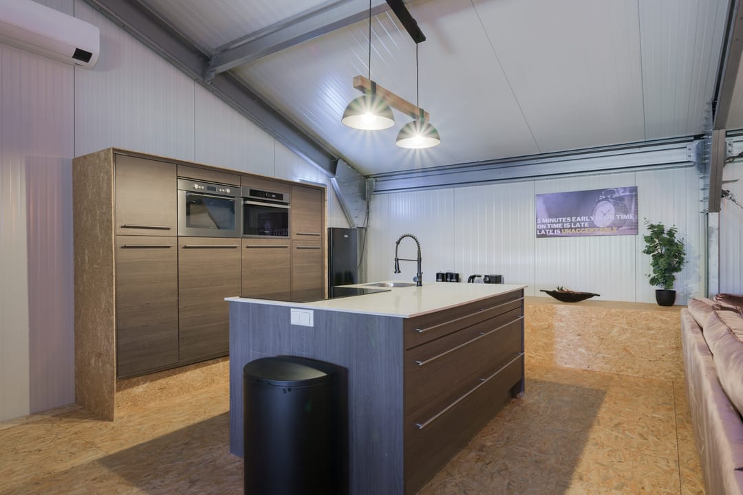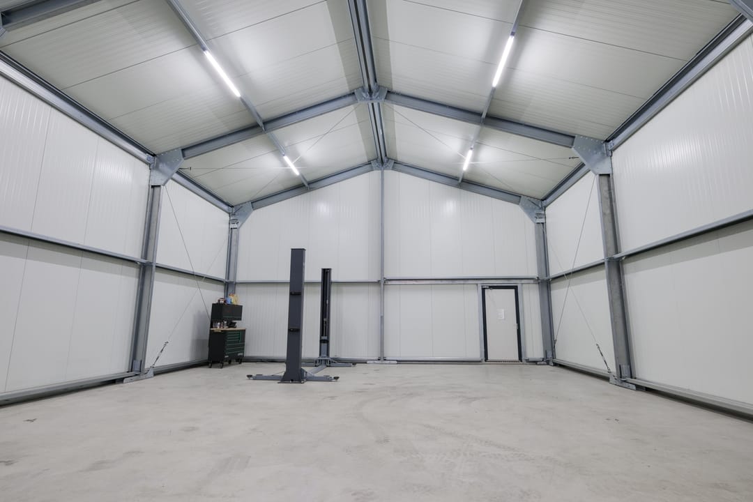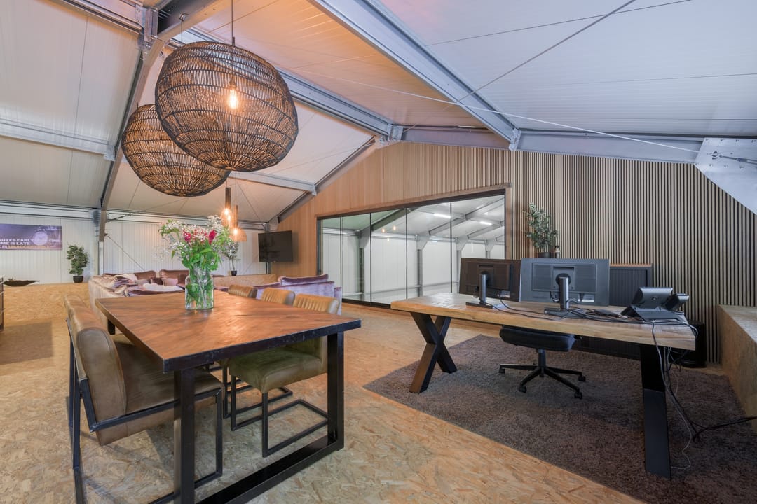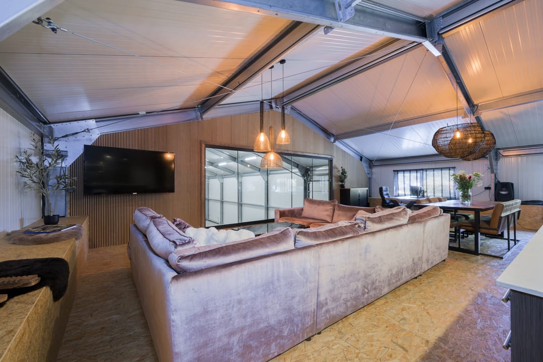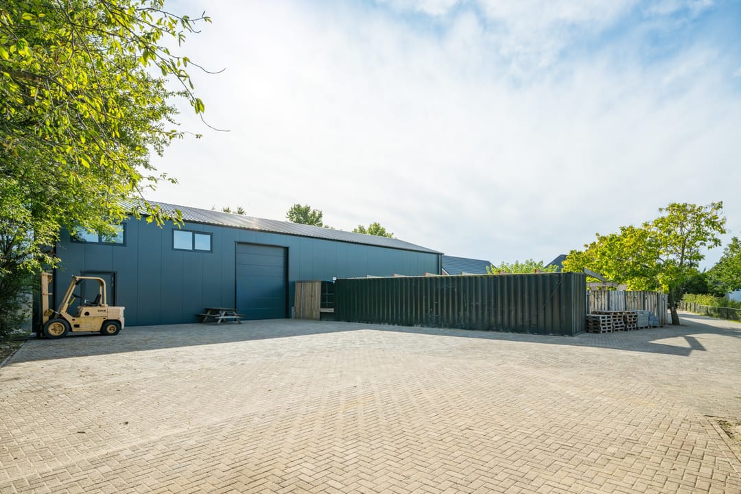 Grote bedrijfshal (ca. 295 m2) met luxe kantoor/mancave (ca. 85 m2). De bedrijfshal is voorzien van een betonvloer, rol segmentdeur, loopdeur en separate entree met toilet.