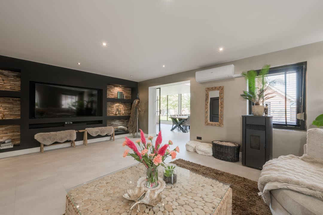De woning en bedrijfshal geheel gasloos, verwarming middels airco, (pelletkachel ter overname) en warmtepompboiler(300 liter).