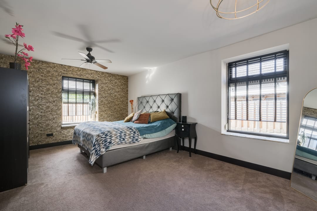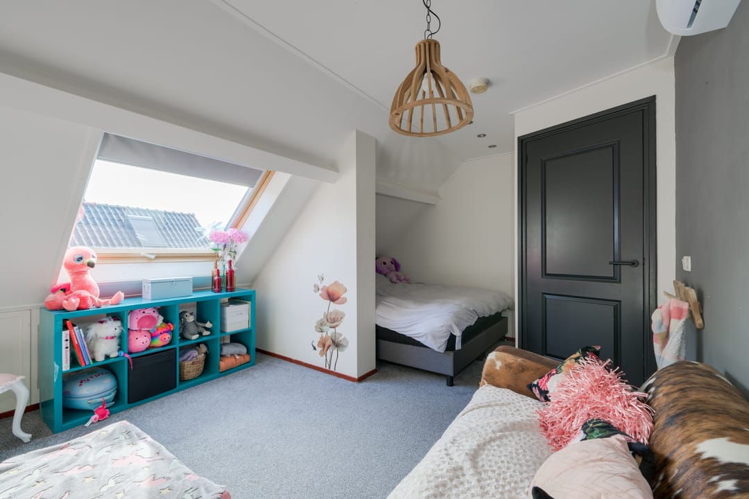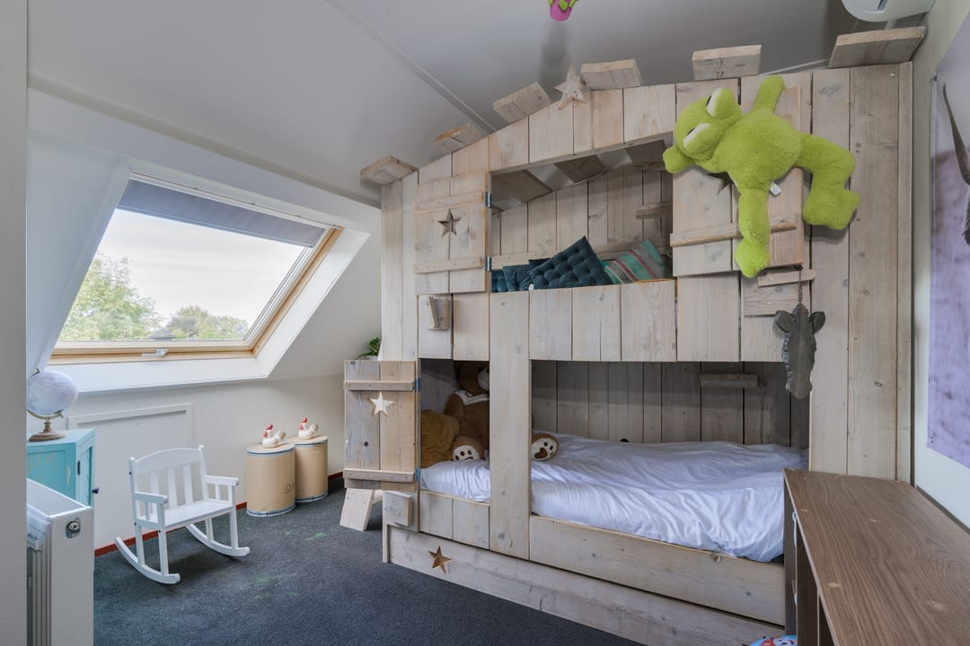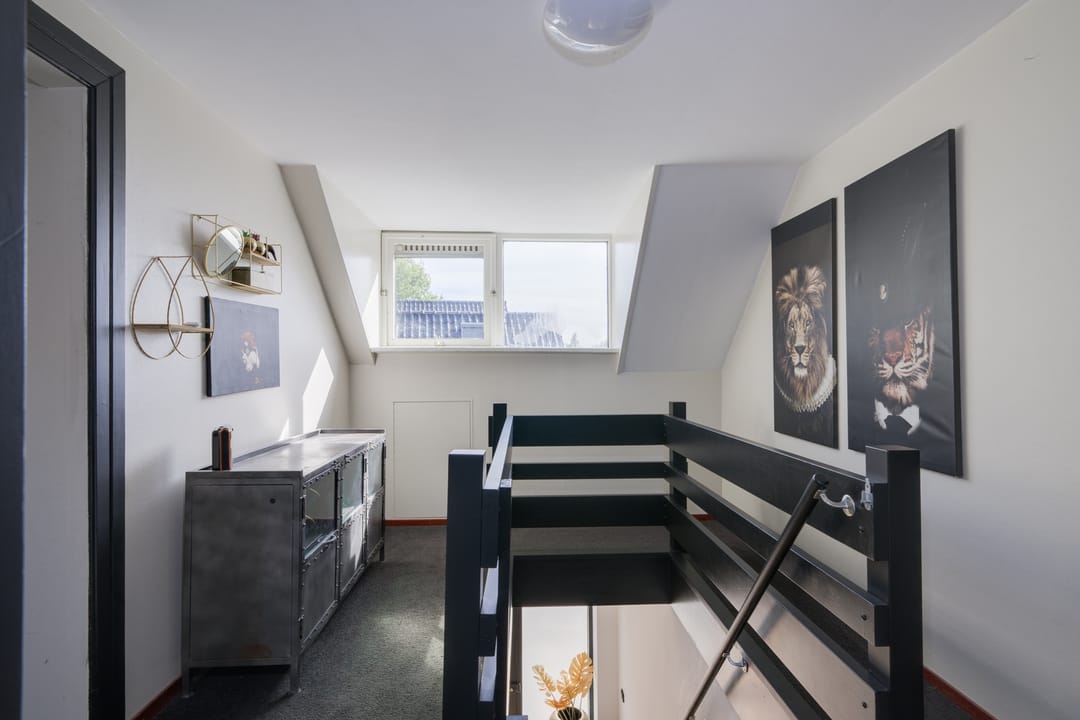 Verdieping: Overloop, drie slaapkamers waarvan één in gebruik als inloopkast, tweede badkamer met inloopdouche, wastafel en toilet. Vlizotrap naar bergzolder.