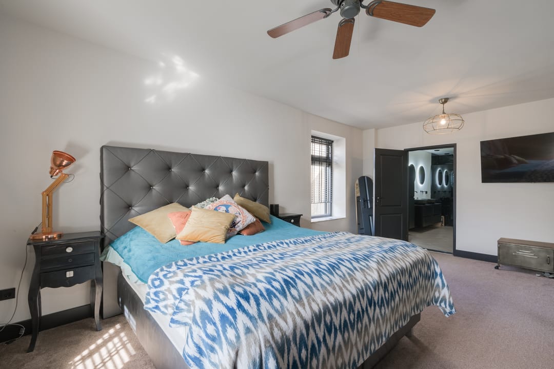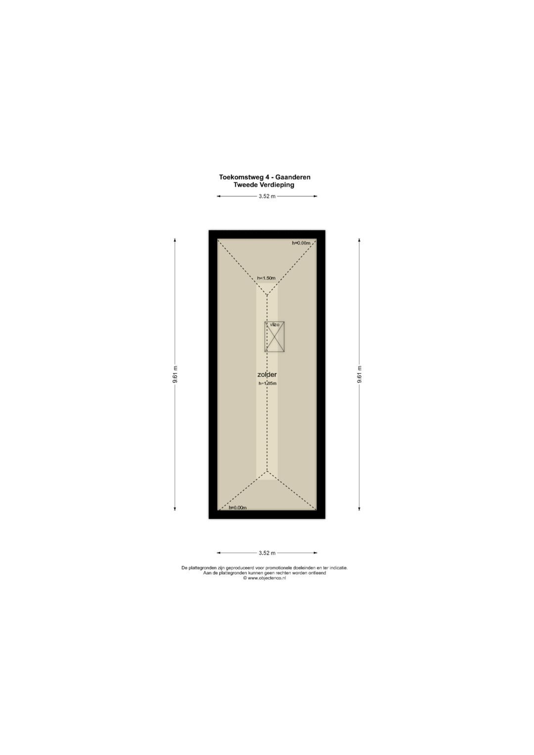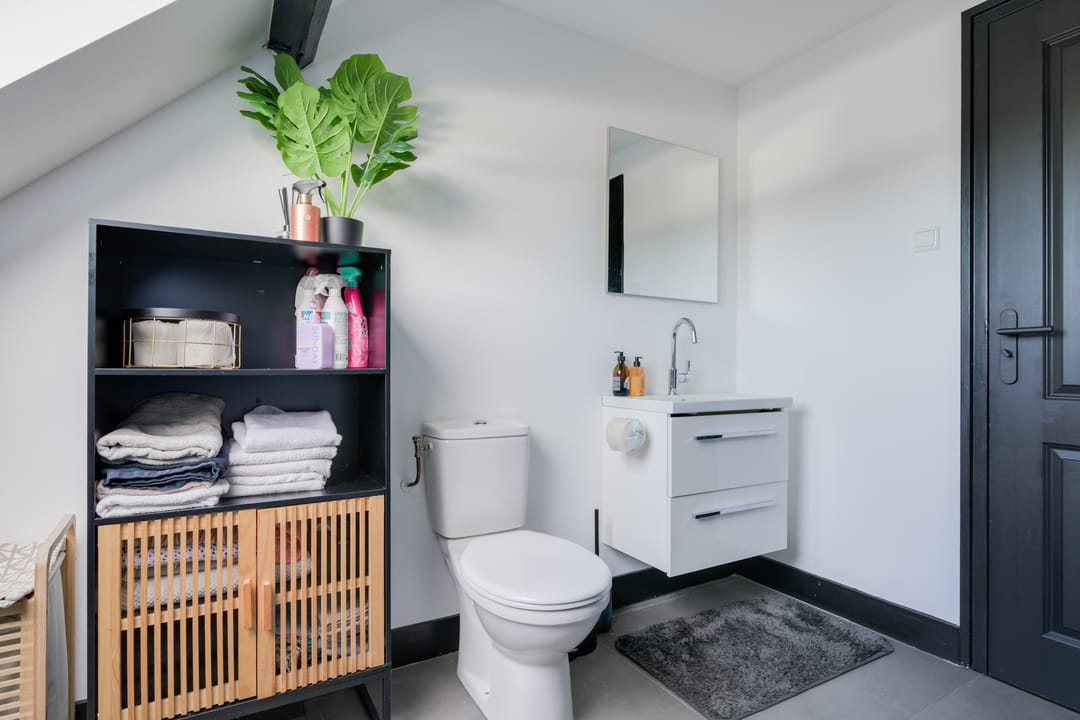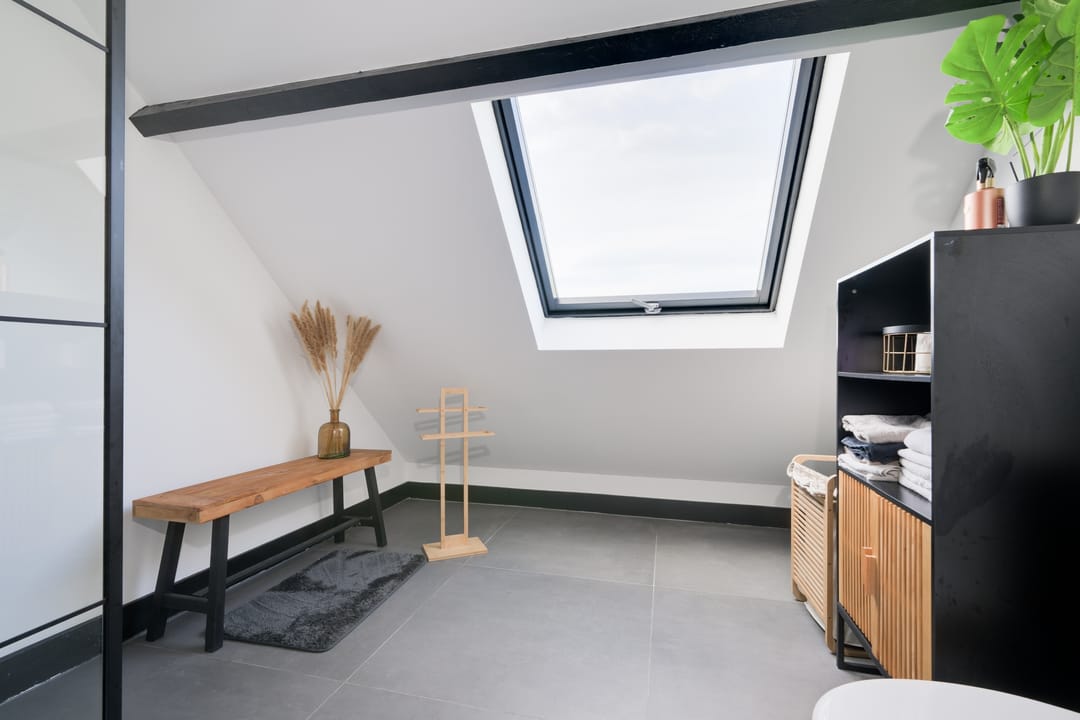 Verdieping: Overloop, drie slaapkamers waarvan één in gebruik als inloopkast, tweede badkamer met inloopdouche, wastafel en toilet. Vlizotrap naar bergzolder.
