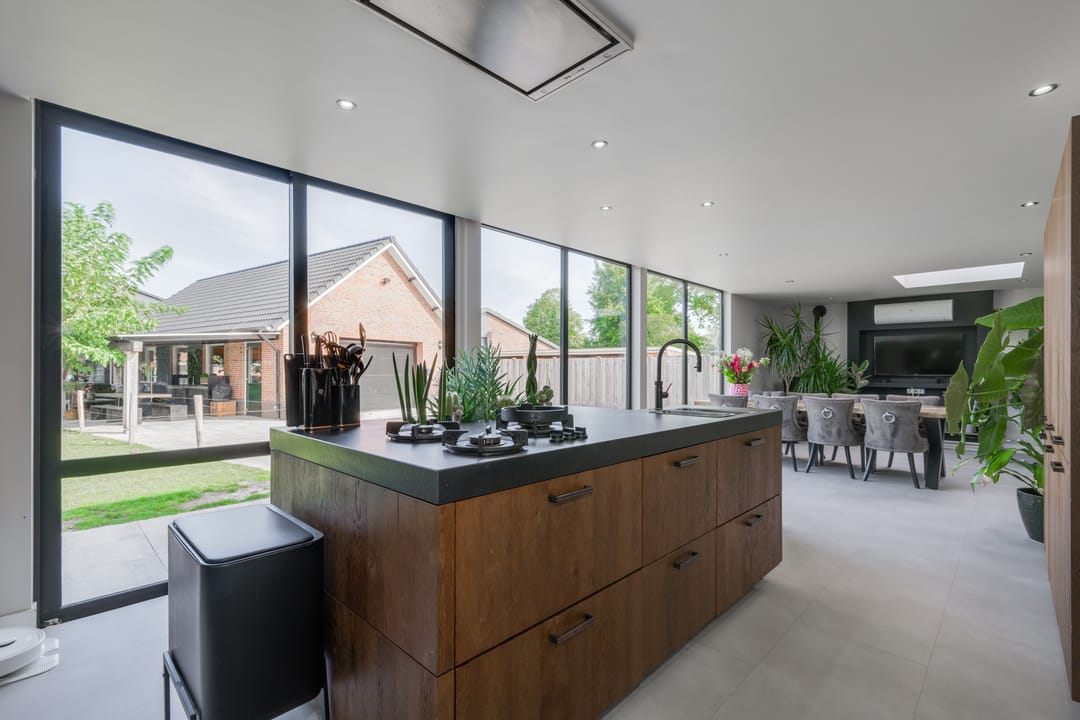Begane grond: Entree met meterkast, voorraadkelder en trapopgang. Ruime woonkamer met cinewall, aparte speel- of werkkamer en een uitgebouwde woon-eetkeuken over de volle breedte van de woning met glazen achtergevel en luxe keukenmeubel met kookeiland (inbouw-apparatuur o.a. vaatwasser, afzuiging verwerkt in plafond, 3 gaspitten in het werkblad, koel-vriescombinatie, wijnklimaatkast, combi-stoomoven. Riante hoofdslaapkamer met aangrenzende moderne badkamer ( dubbele wastafel met meubel, inloopdouche met twee douches en toilet), grote bijkeuken met wasruimte, toilet en extra achter-entree.