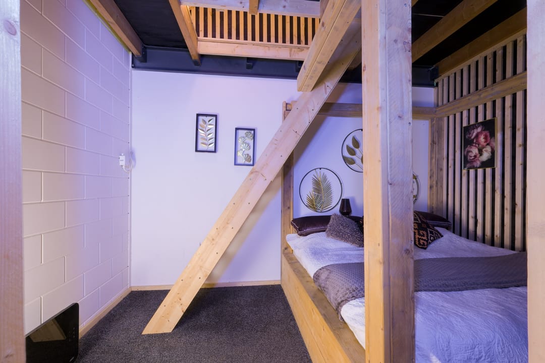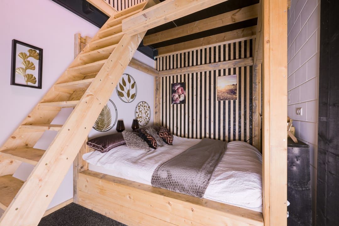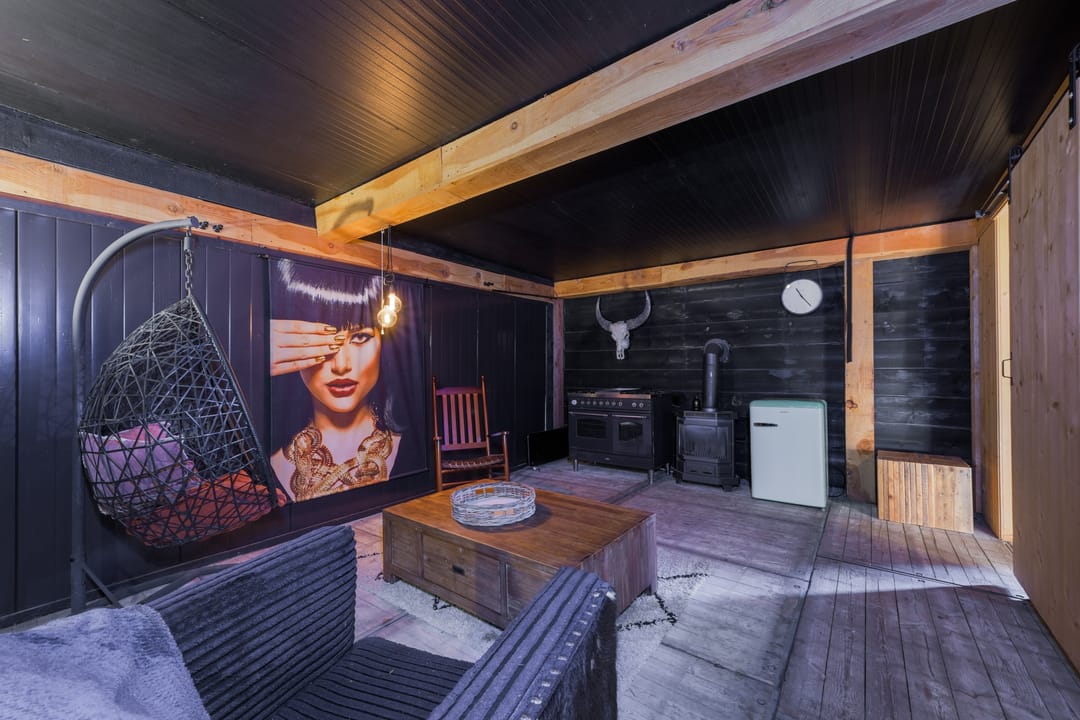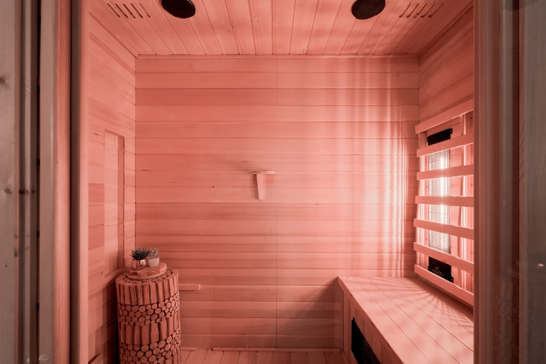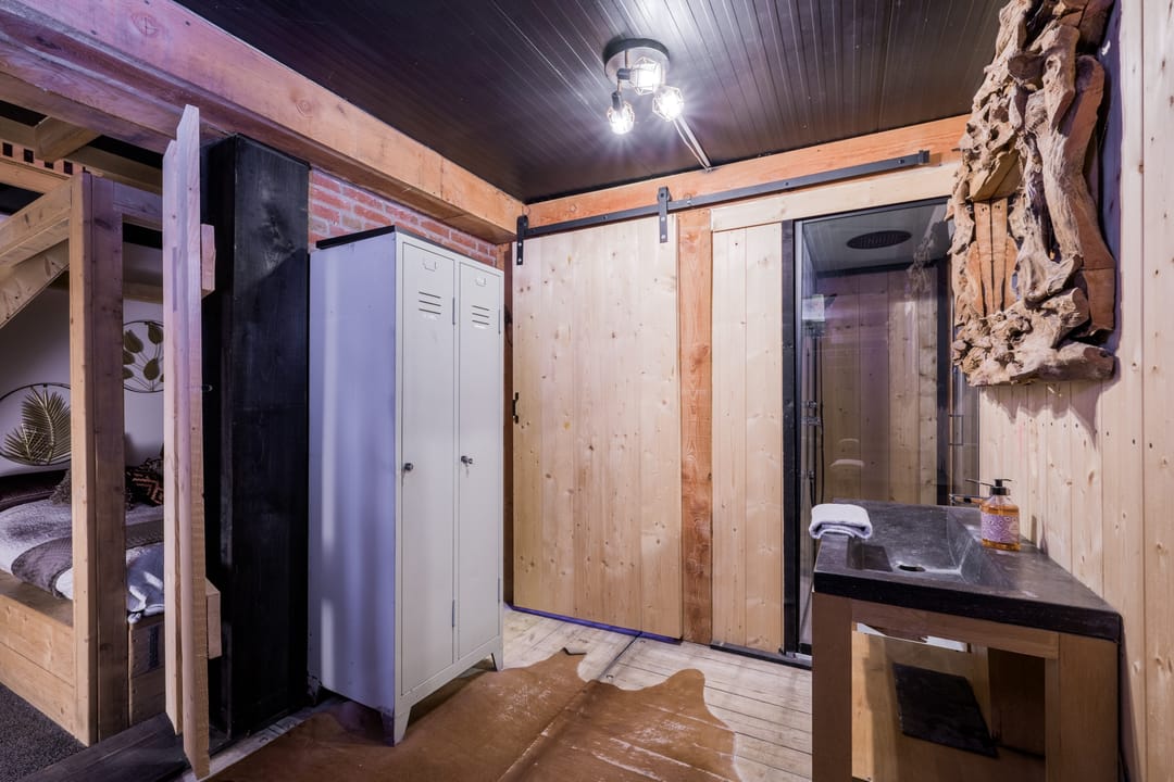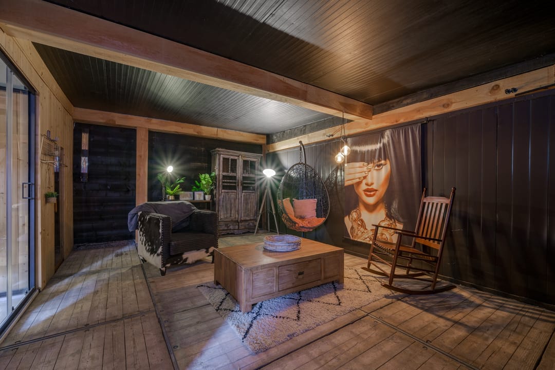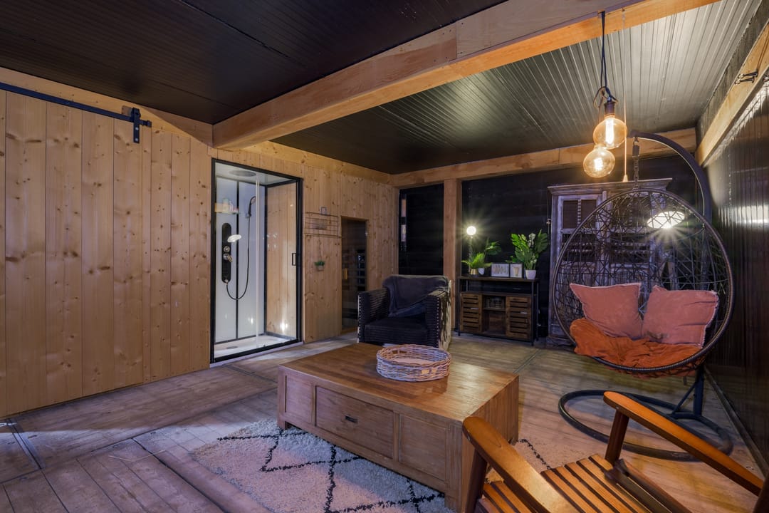 Houten chalet (ca. 57 m2) ingericht als wellnessruimte met toilet, infrarood sauna, doucheruimte, ontspanningsruimte en extra slaapkamer.