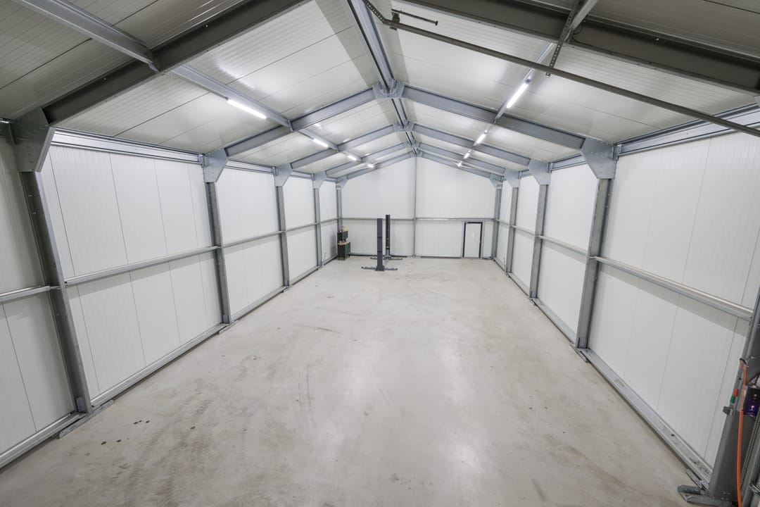 Goed geïsoleerde bedrijfsruimte (ca. 75 m2 begane grond) en met rol segmentdeur en verdieping (ca. 70 m2), geschikt als opslag/werkplaats of stalling voor meerdere auto’s.
