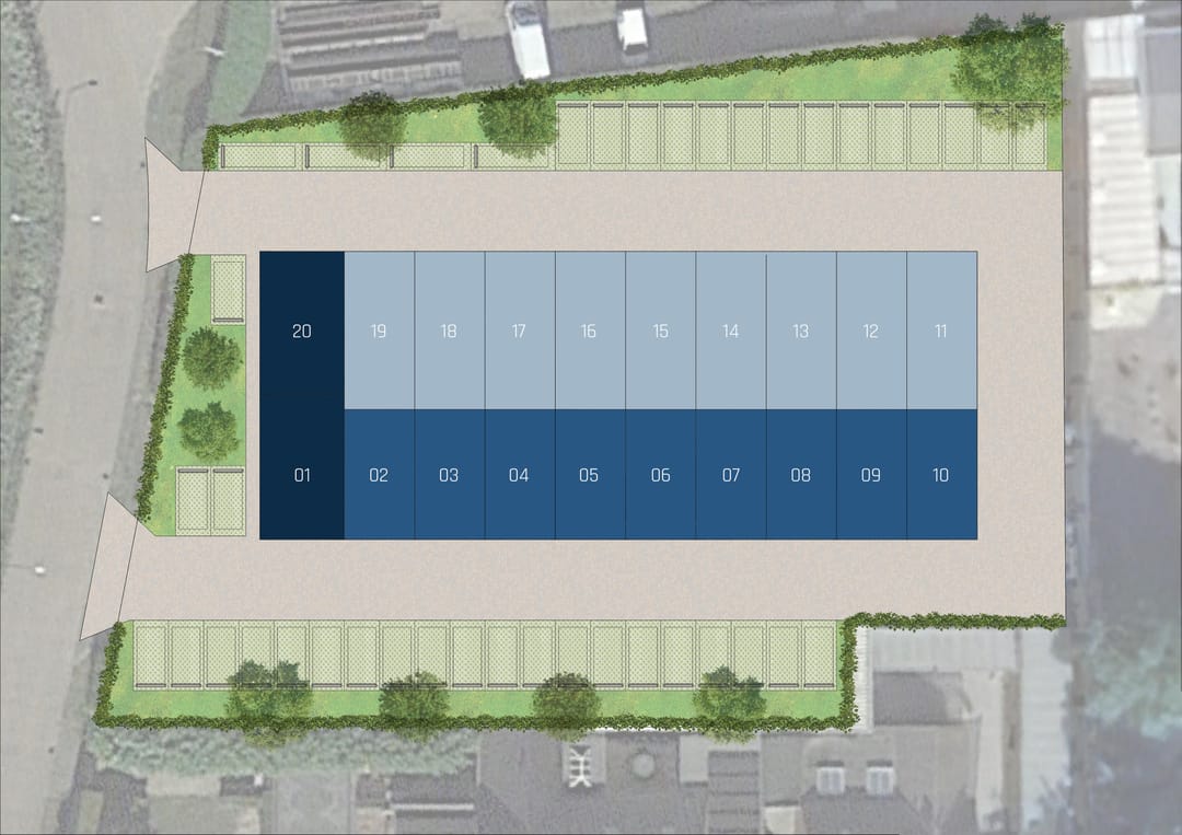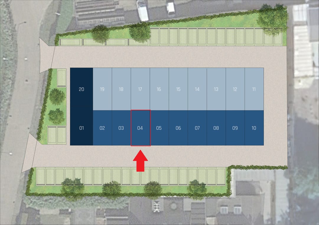 Het terrein rondom het bedrijfsverzamelgebouw wordt volledig verhard en ingericht met voldoende parkeergelegenheid. Bij deze unit behoren minimaal twee eigen parkeerplaatsen.