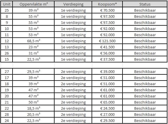 Unit Netto oppervlakte m² Verdieping Koopsom* Status