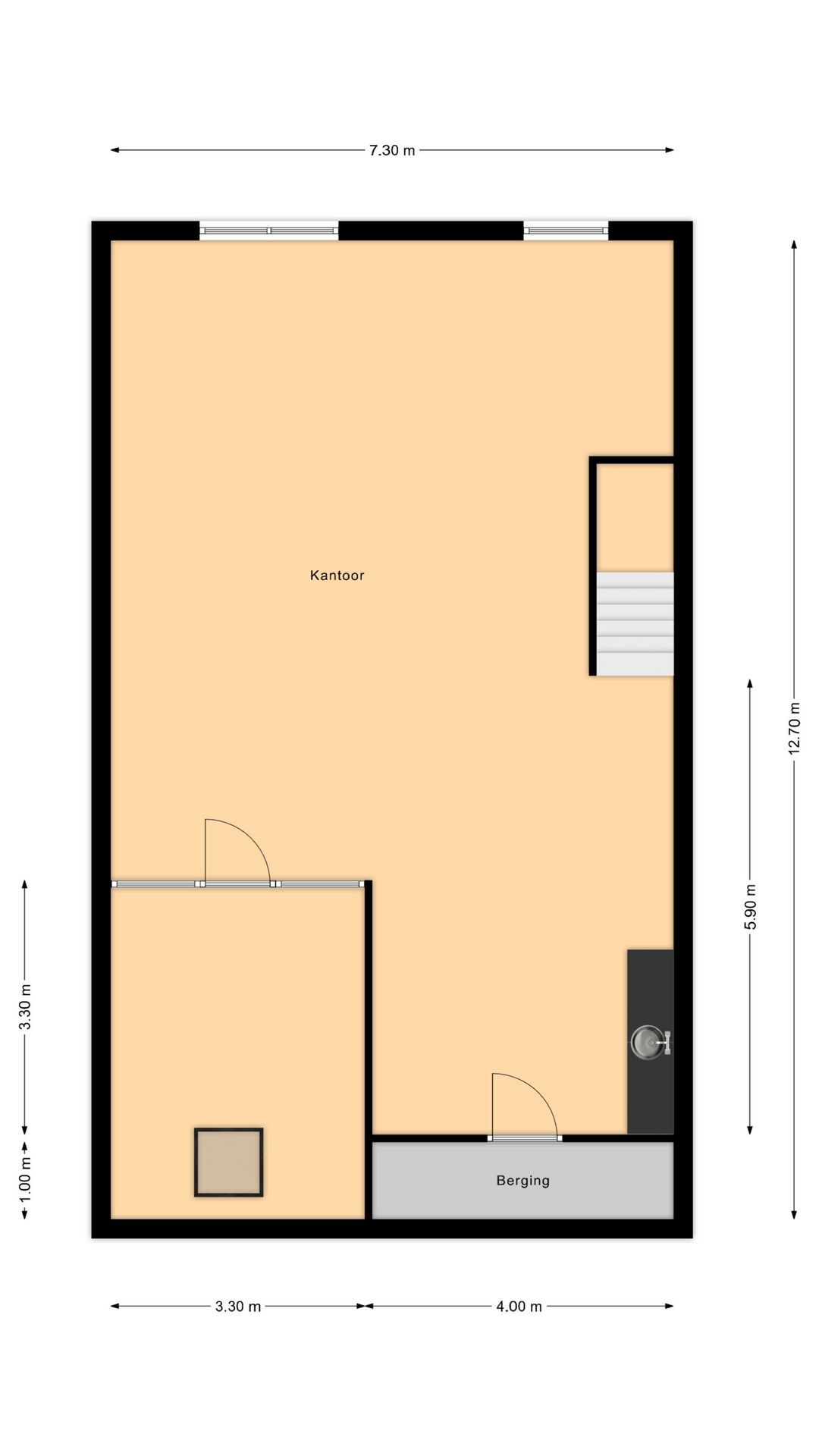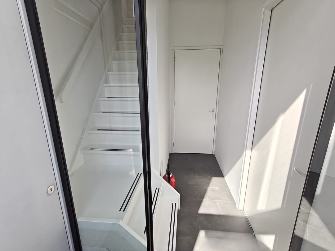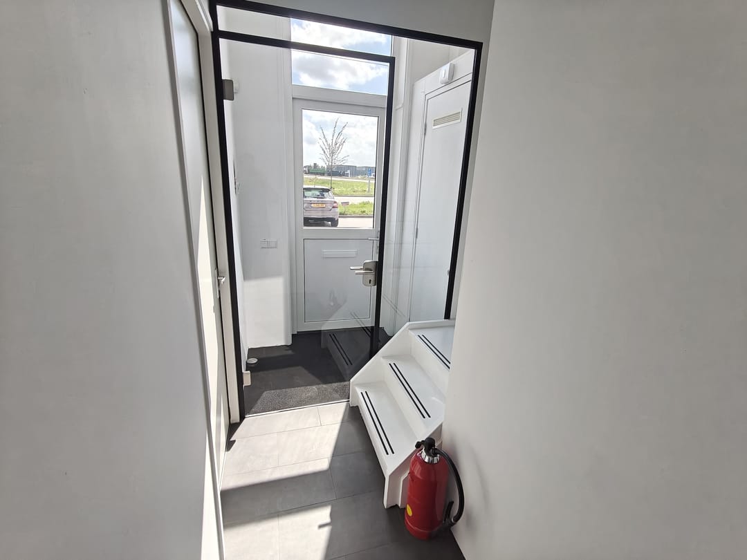 Begane grond: Overheaddeur en entreedeur naar de bedrijfsruimte op de begane grond. Vanaf hier is met de trap de eerste verdieping te bereiken.