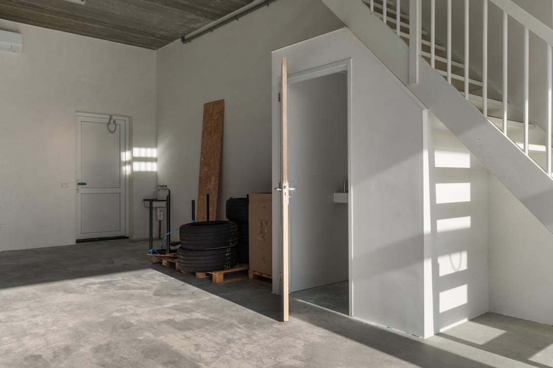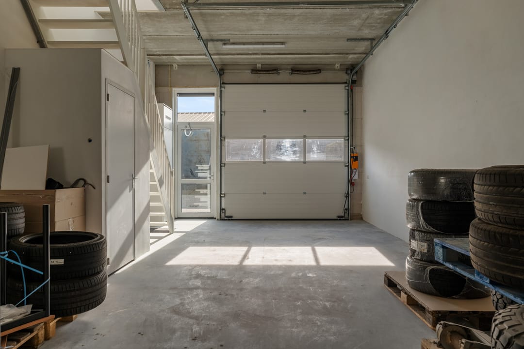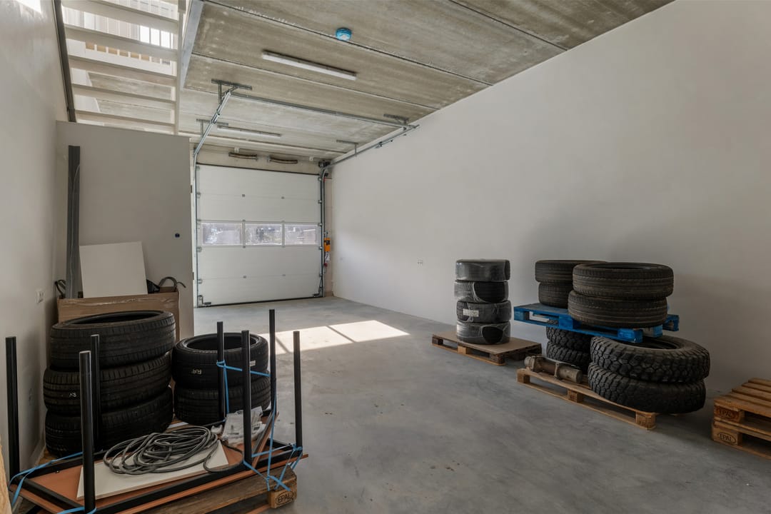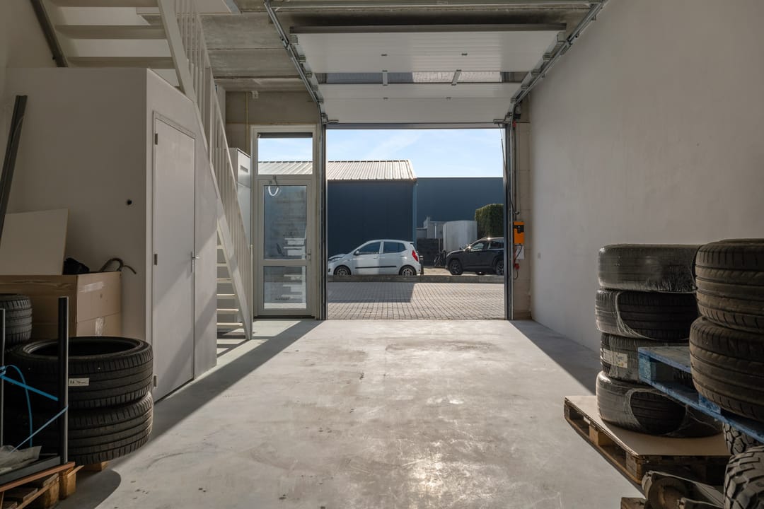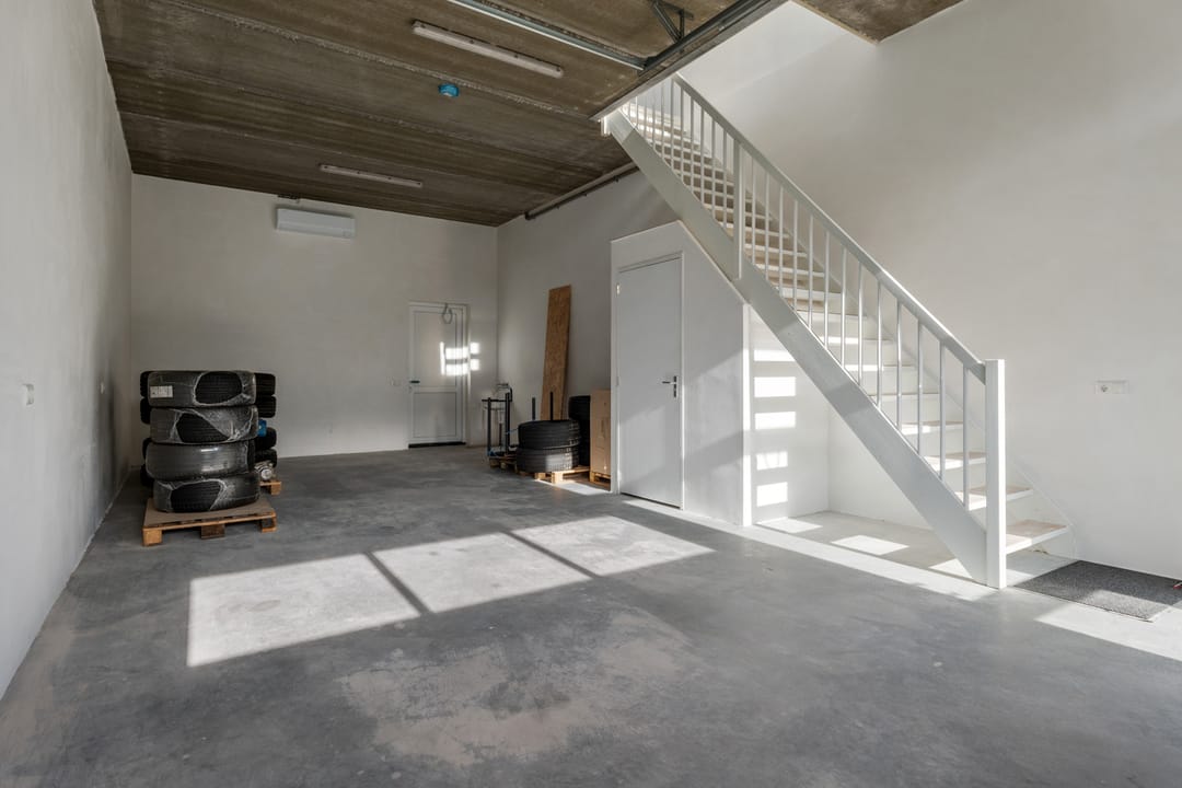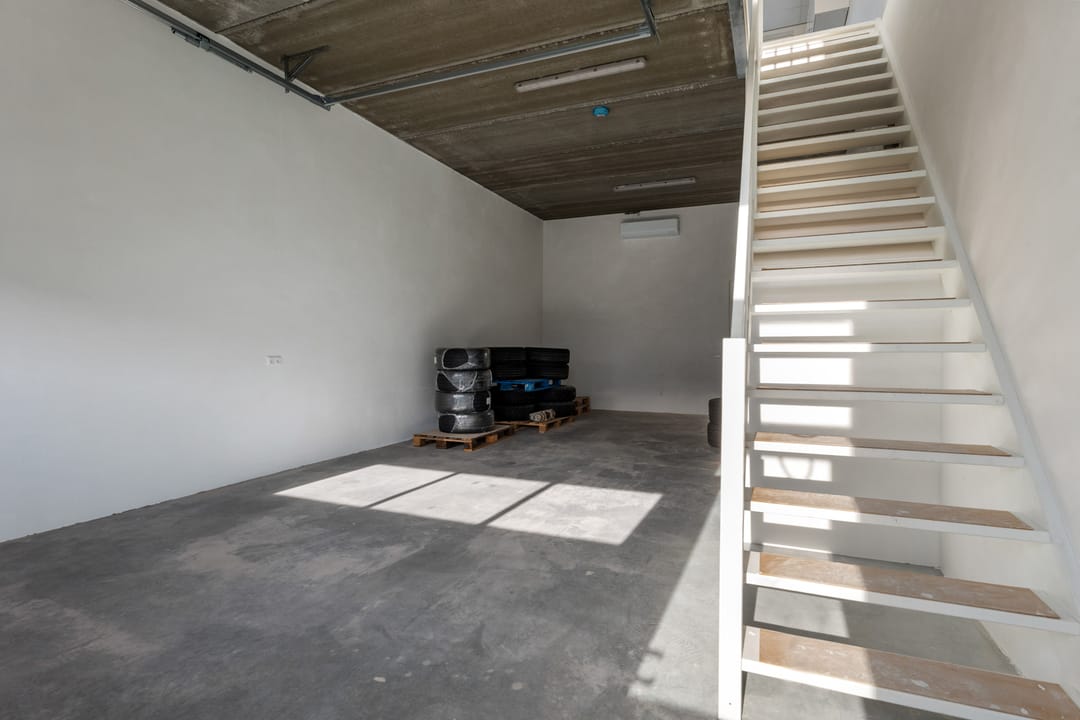 Representatieve entree met trapopgang naar de verdieping. Bedrijfsruimte met betonnen vloer en een elektrisch bedienbare overheaddeur, ideaal voor opslag of werkruimte. Daarnaast bevindt zich op de begane grond een toilet met fonteintje.