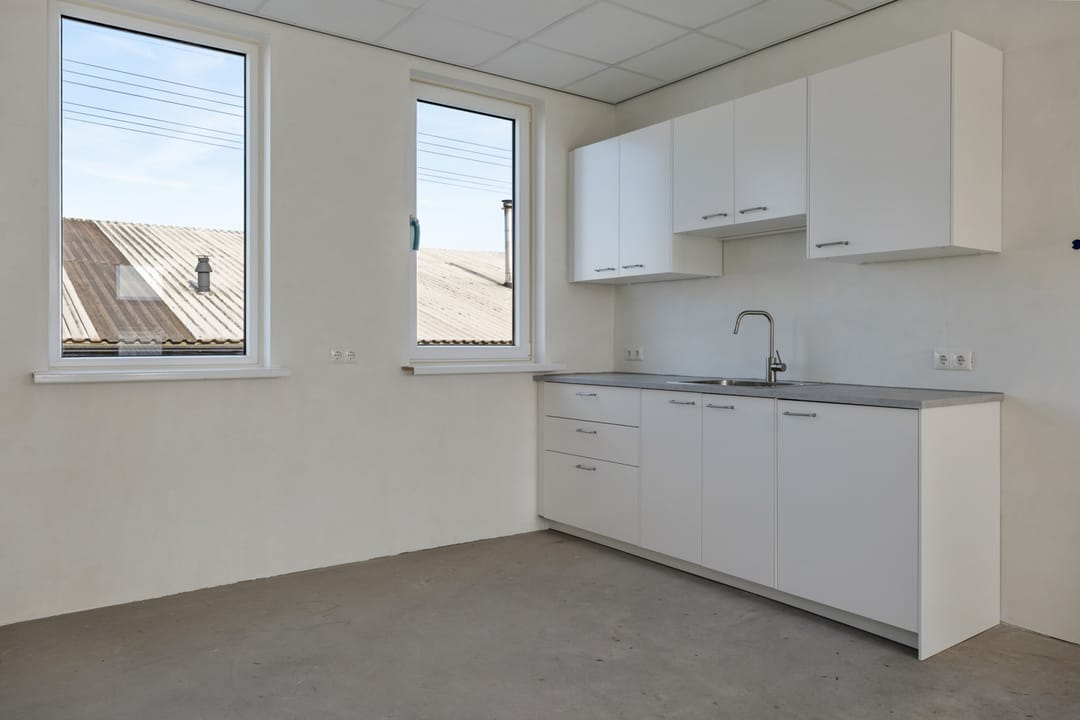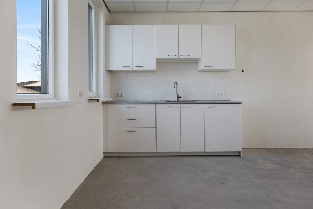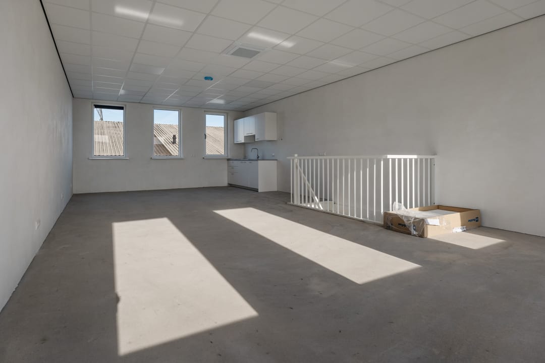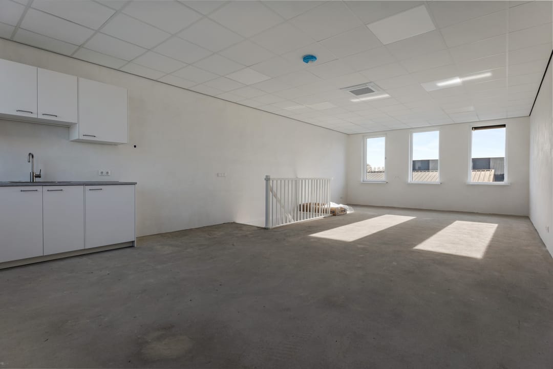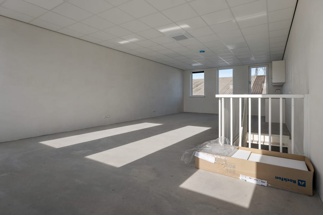Ruime open ruimte met mogelijkheden voor kantoorruimte, opslag of werkruimte. De verdieping is voorzien van een betonnen vloer en een keukenblad met spoelbak.