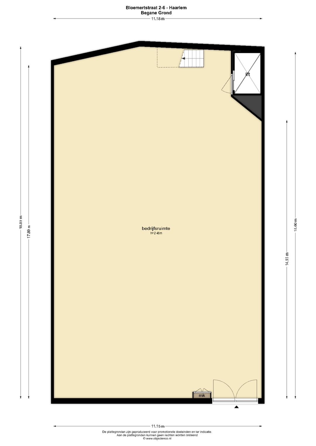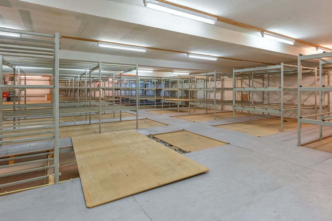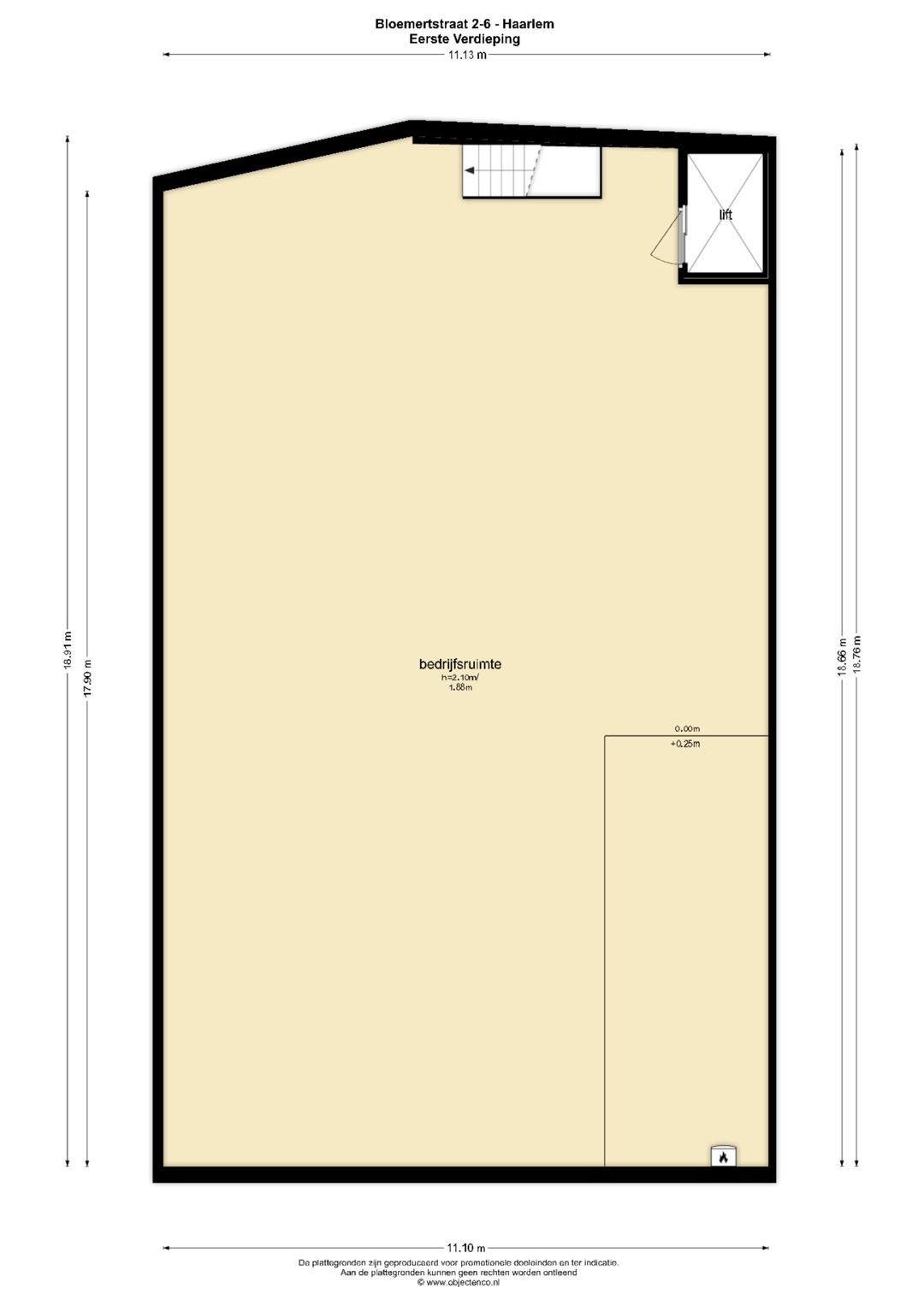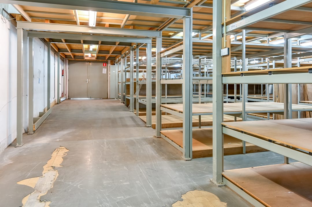 Ca. 200 m2 vloeroppervlakte parterre (ca. 2.48 meter hoog) plus een etage (middels stalen frame) van ca. 200 m2 (ca. tussen 1.88 en 2.10 meter hoog).