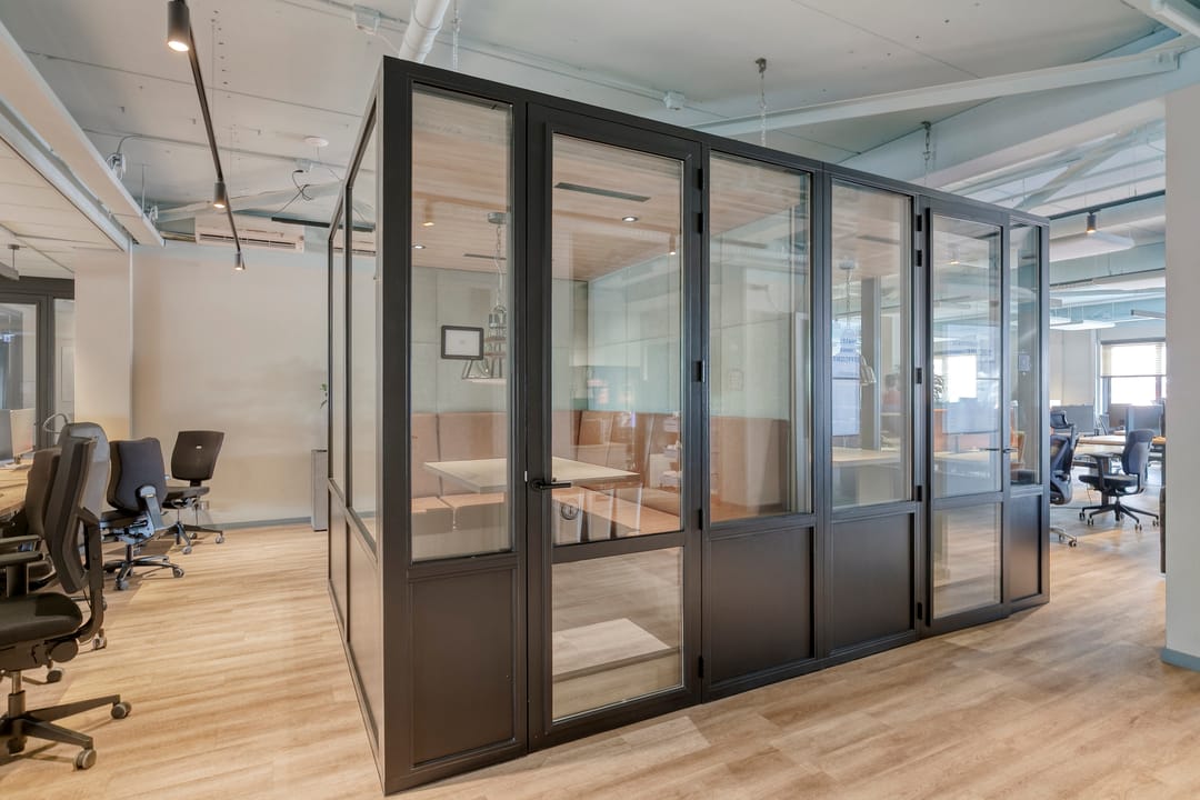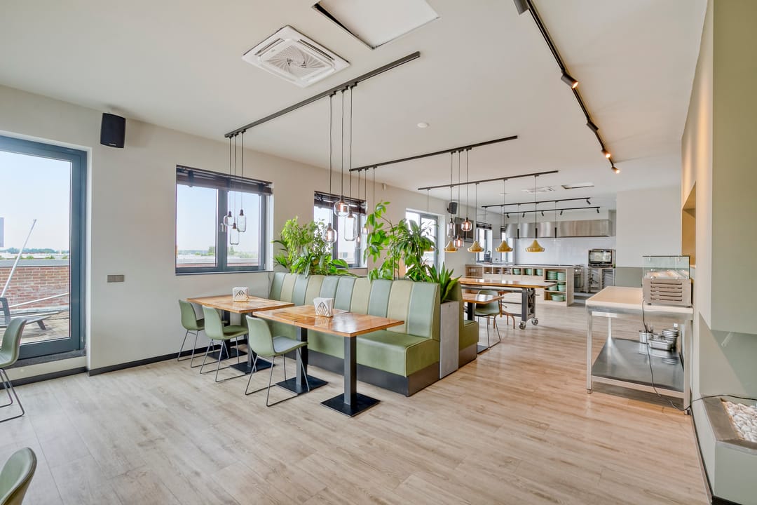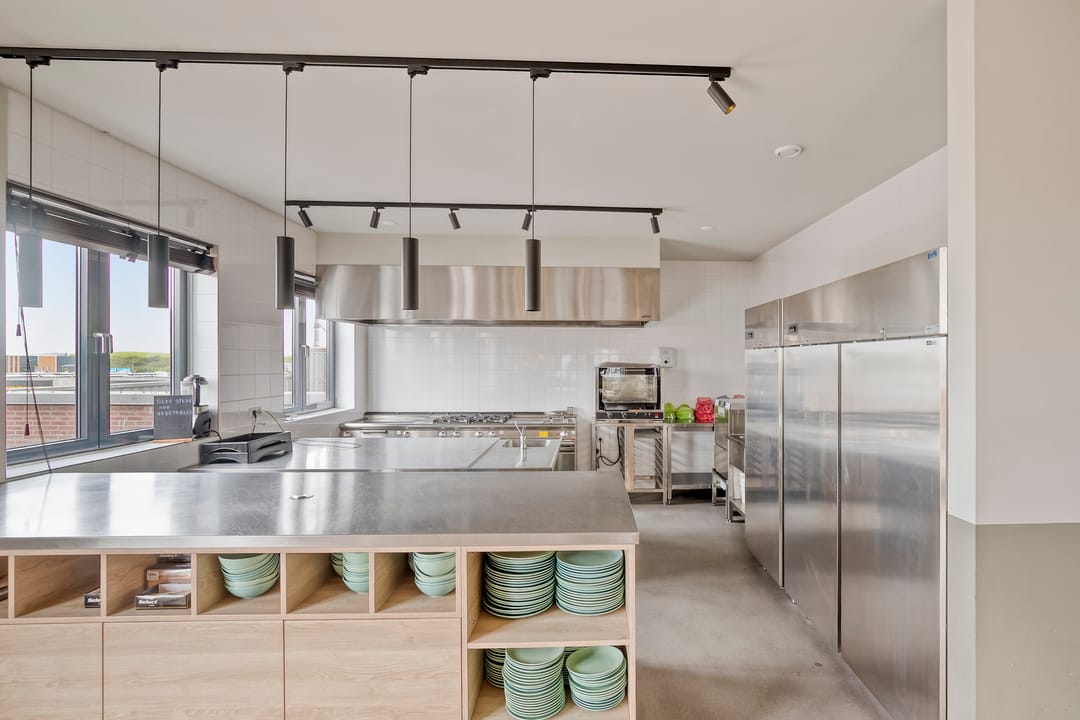 The second floor features several offices, a restroom, and a professional kitchen. This floor also provides access to the spacious roof terrace overlooking the Spaarne River.