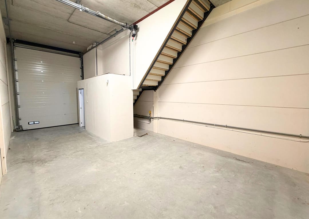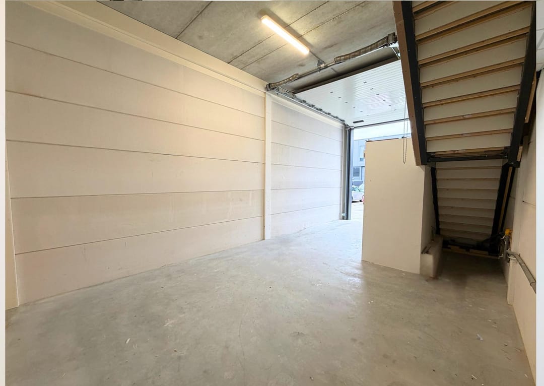The business space is located on deck level and is accessible via a heated ramp. It features an electric overhead door and a separate pedestrian door.