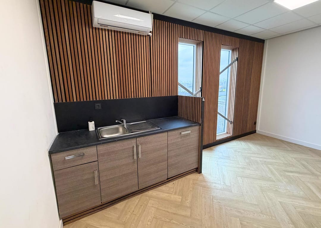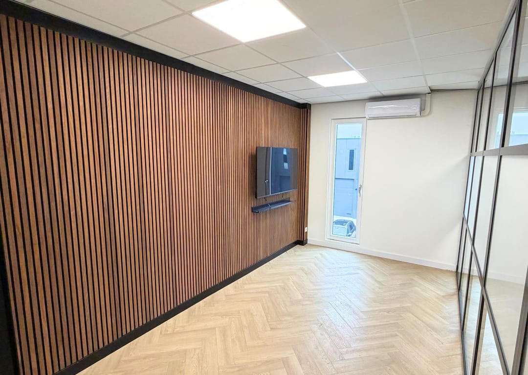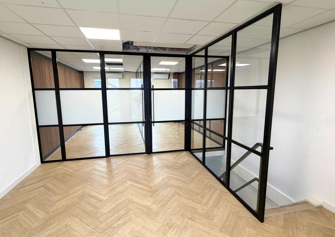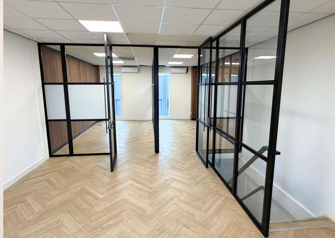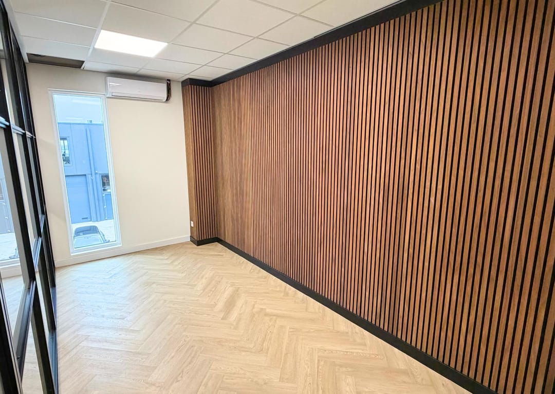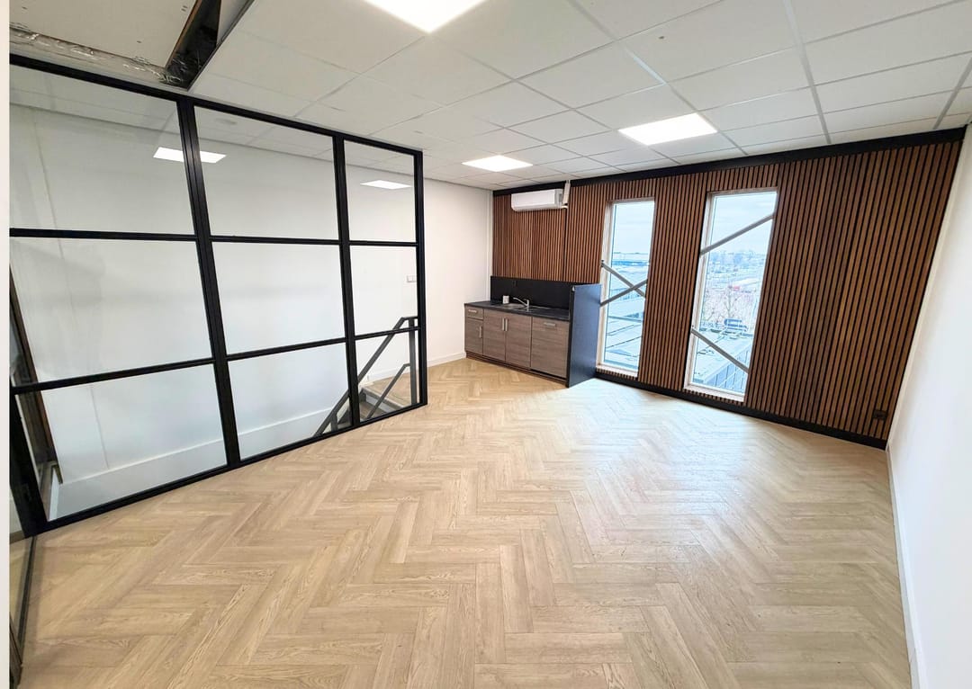 • The office floor features a herringbone PVC floor and suspended ceiling with LED lighting;