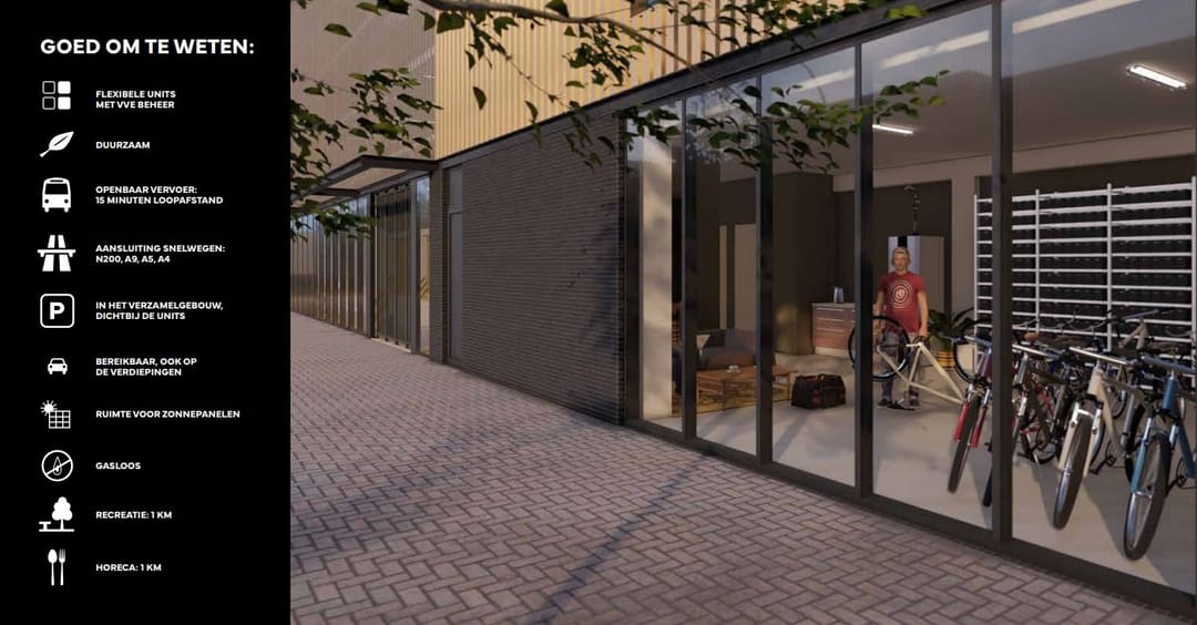 • Parkeren kan gratis in het verzamelgebouw, dichtbij de units; ook is er voldoende ruimte voor laden en lossen. Busjes kunnen zelfs tot aan de voordeur komen.