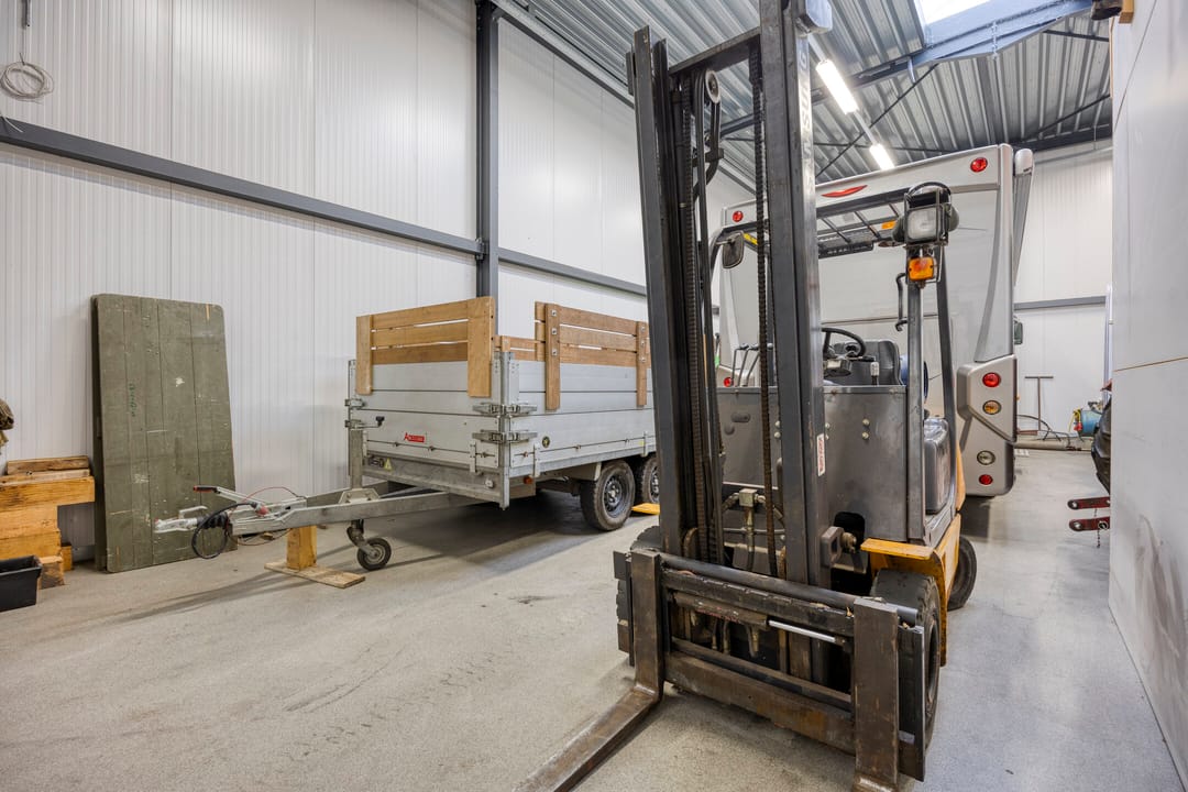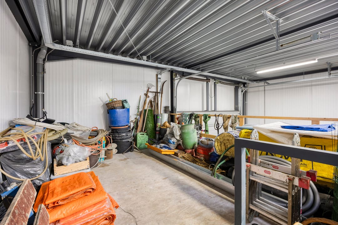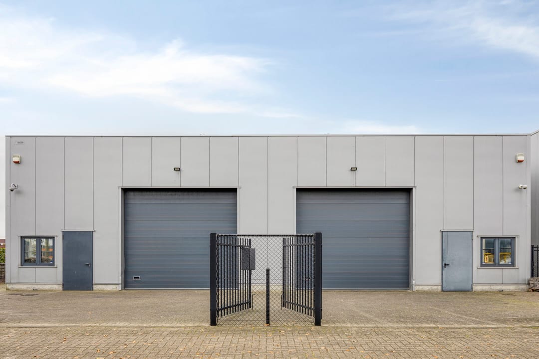 Loods I, 126 m² (9 x 14), v.v. gecoate betonnen vloer, dubbele overheaddeur (voor + achter), opgetrokken uit een staalconstructie met sanwichpanelen, (lichtstraat), geïsoleerde dak voorzien van dakdichting Trocal. Pantry met keukenblok en betegelde toilet-/doucheruimte.