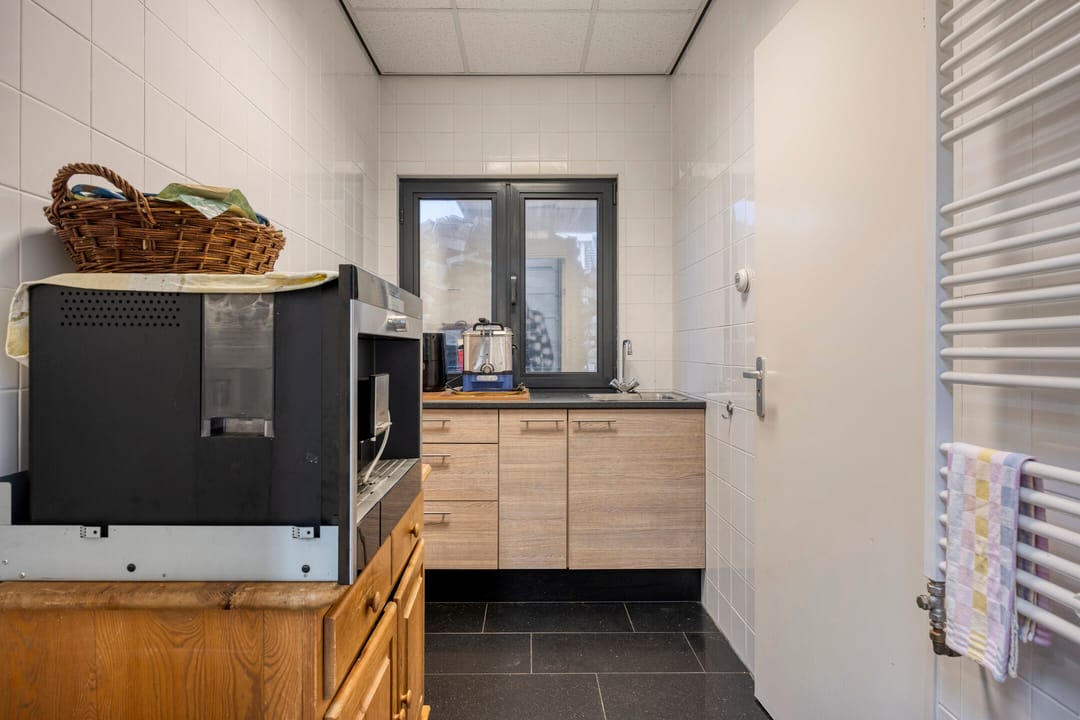 Entree/hal met meterkast, trapopgang, openslaande glas in lood deuren naar woonkamer. L-vorm kamer met speksteenkachel, toegang gang en toegang keuken, middels glas in lood en suite deuren. Gang met toegang tot werk/slaapkamer voorzijde, geheel betegelde badkamer met inloopdouche, urinoir, wandcloset, dubbele wastafel in meubel, designradiator en vloerverwarming. Master bedroom aan achterzijde met openslaande deuren naar tuin en garderobegedeelte. Gang en slaapkamers hebben laminaat. Woonkamer, bijkeuken en keuken plavuizen vloer. Keuken (eet) met openslaande deuren en deur naar bijkeuken. Inrichting keuken: groot fornuis met inductie kookplaat, grote oven, afzuigkap, combi-stoom oven, grote koelkast, grote vriezer, koffiecorner, quooker en cube en vaatwasser. Bijkeuken met deur naar tuin, vaste kastenwand, opstelling warmtepomp met buffervat, geheel betegeld toilet met wandcloset en fonteintje. Begane grond, ingebouwde integraal airco systeem in slaapkamer, werkkamer, woonkamer en keuken. In de badkamer, in de keuken en in het toilet in de bijkeuken zit tevens een afzuigsysteem voor de afvoer van vocht.