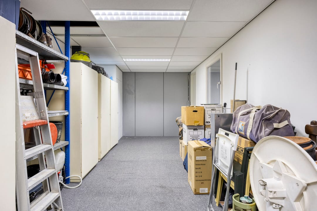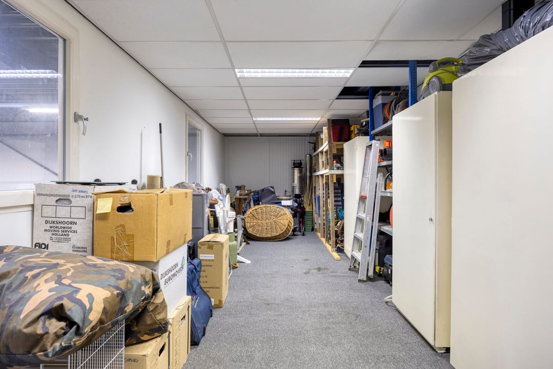 Verdieping via stalen trap, ca. 27 m² (3 x 9) ingericht als opslagruimte.