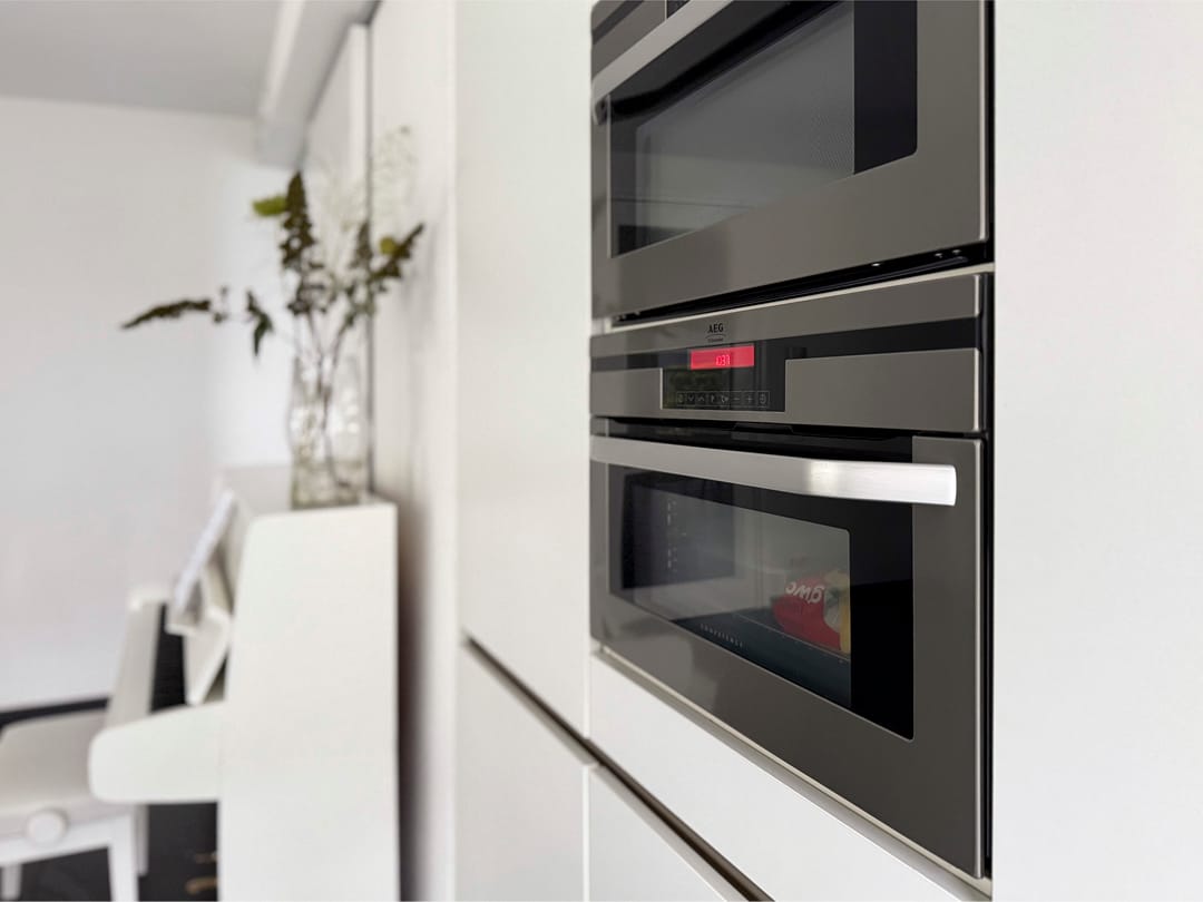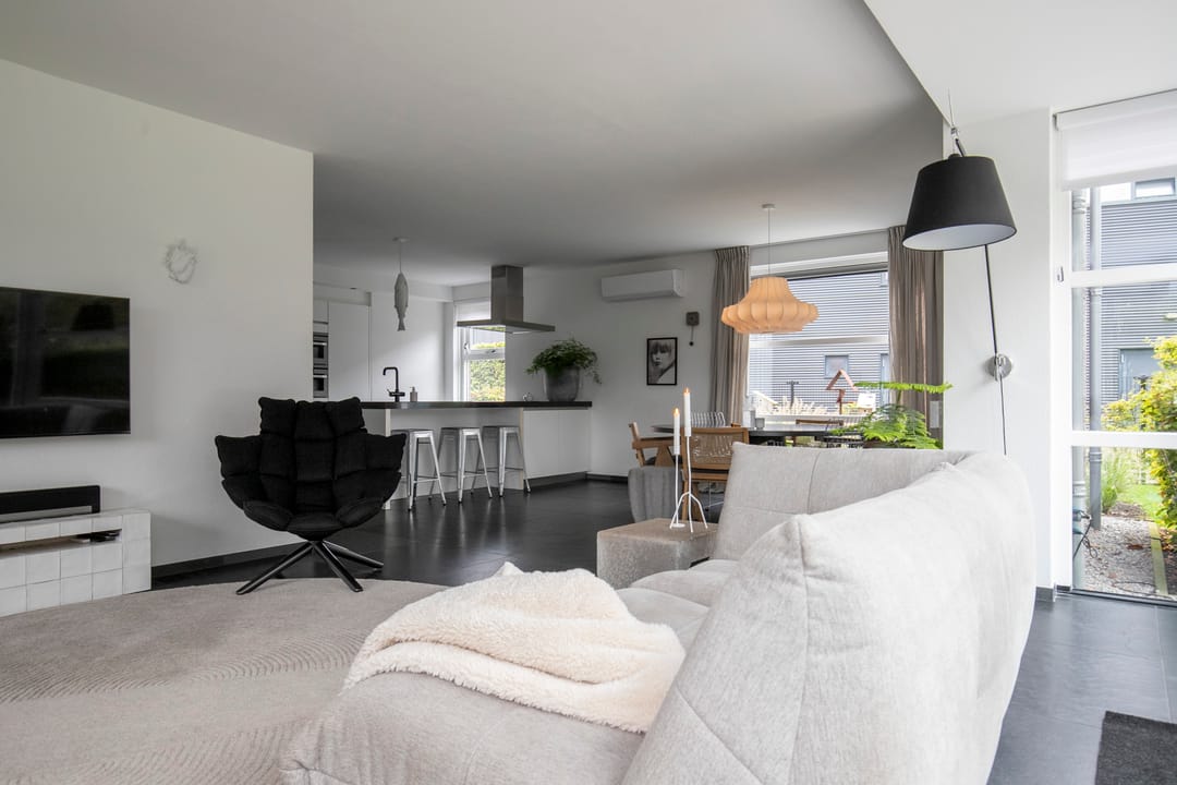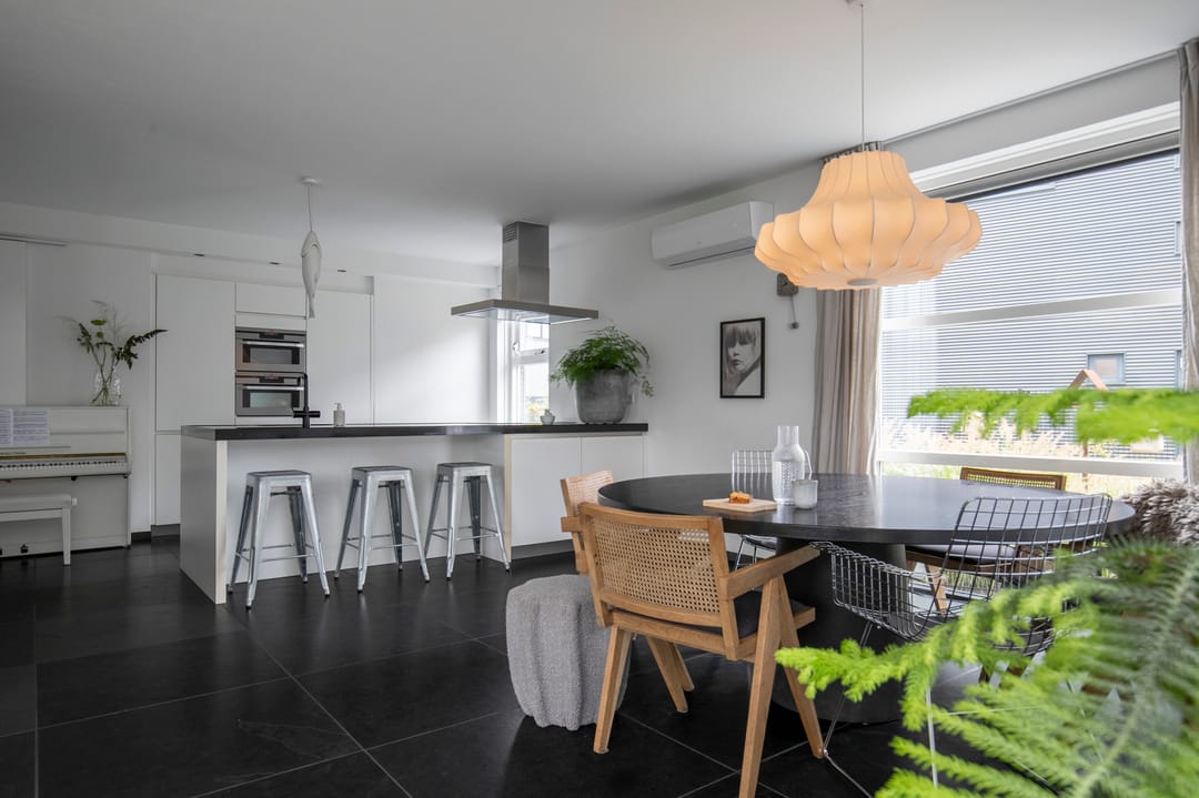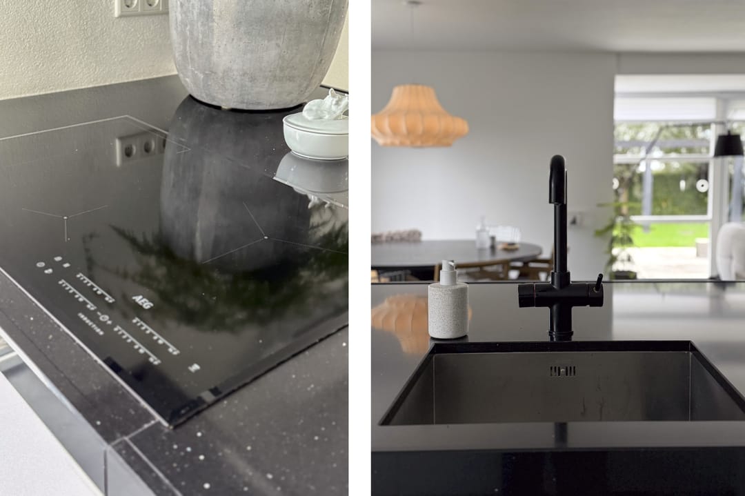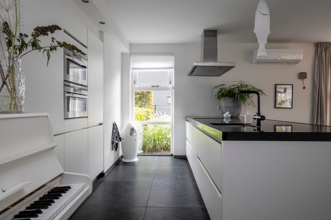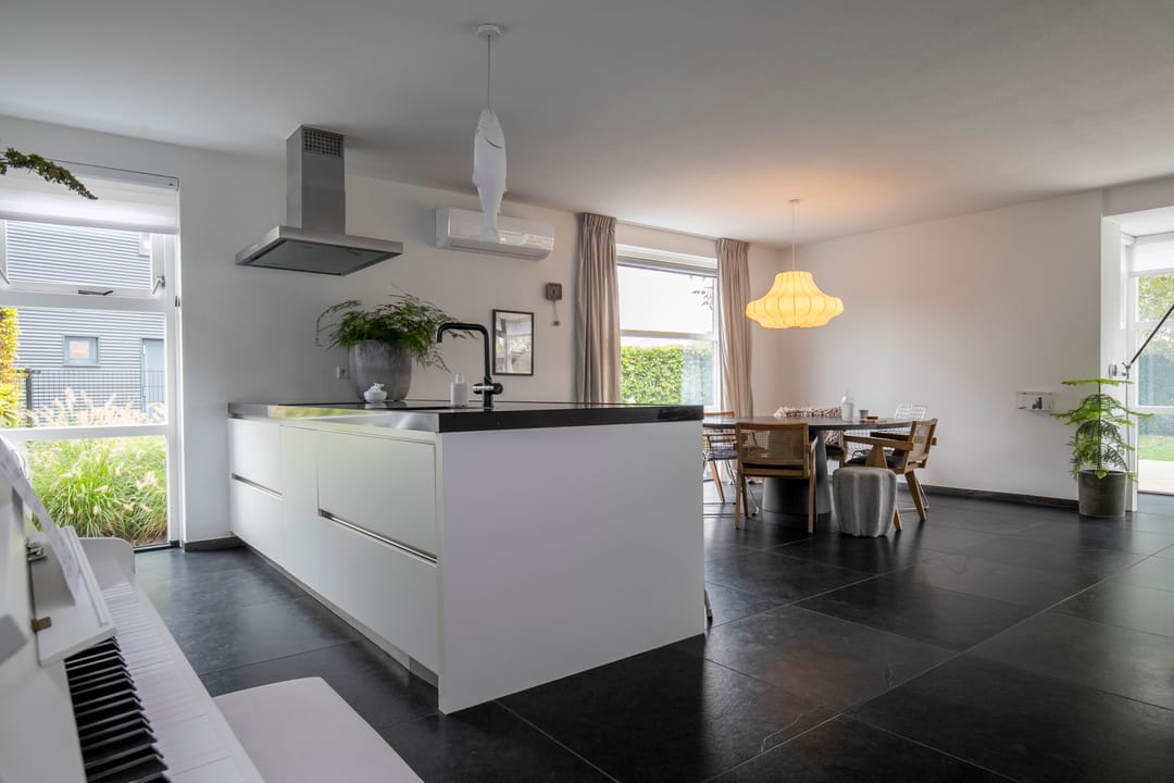 De ruime woonkeuken vormt het hart van de woning. Het strakke, tijdloze design combineert functionaliteit met stijl. De keuken is voorzien van een groot kookeiland met inductiekookplaat, afzuiging, vaatwasser, Quooker en dubbele oven. Hier is het heerlijk koken en samenzijn, met volop werk- en kastruimte.