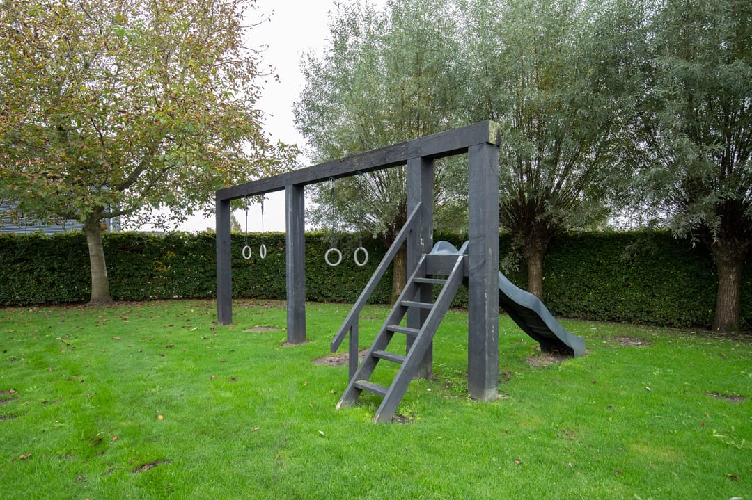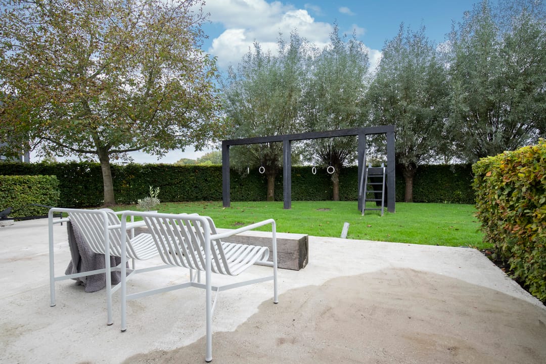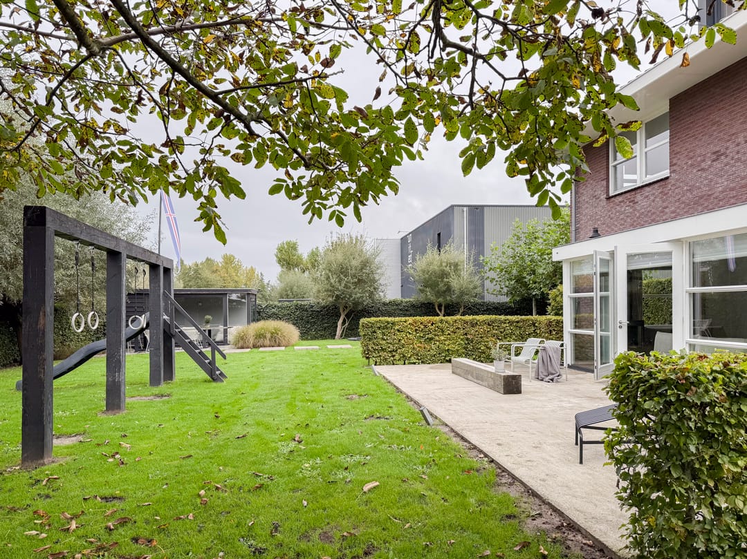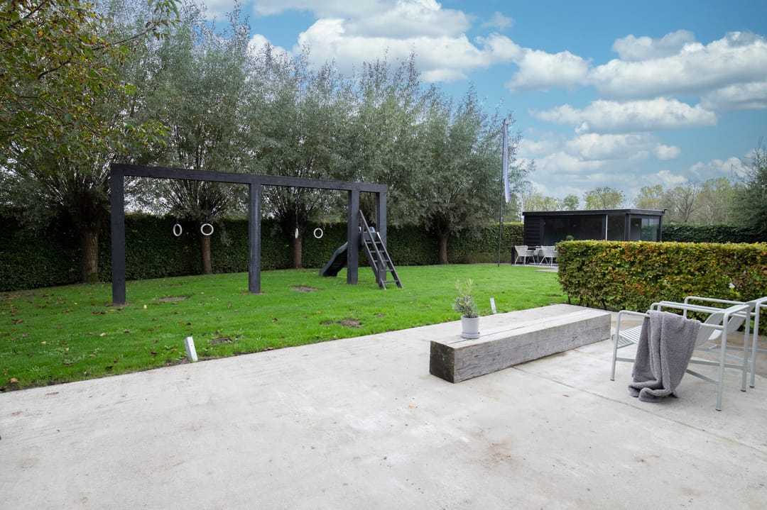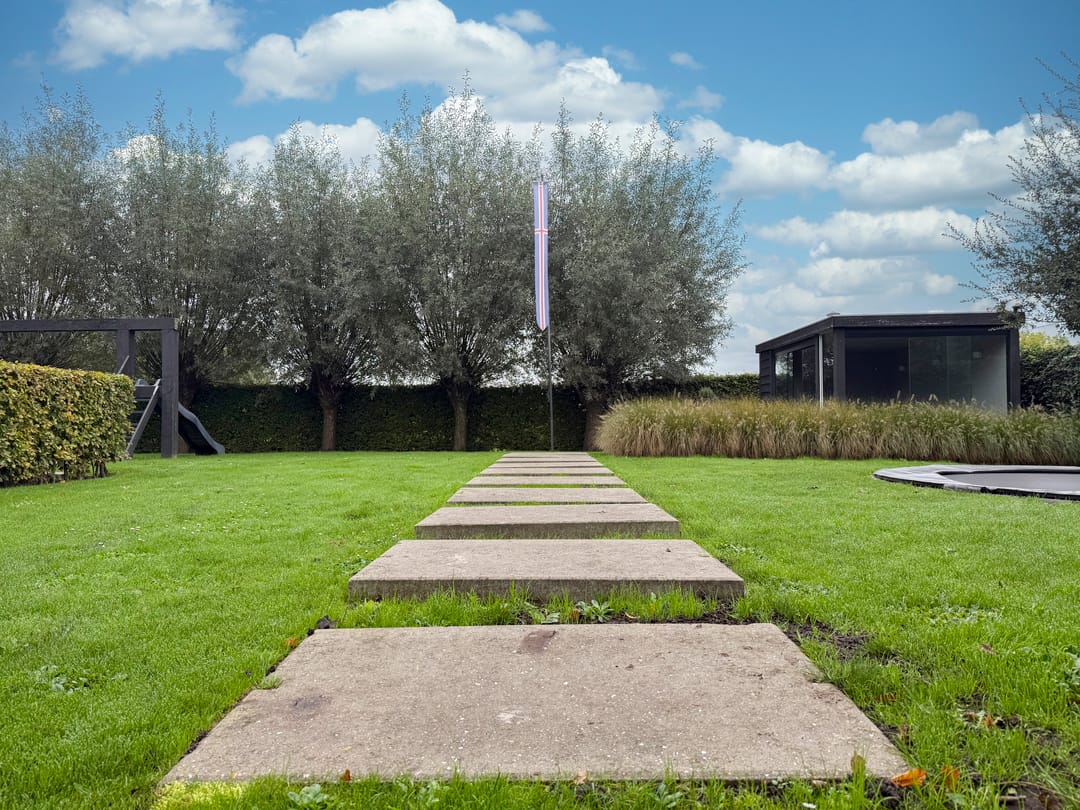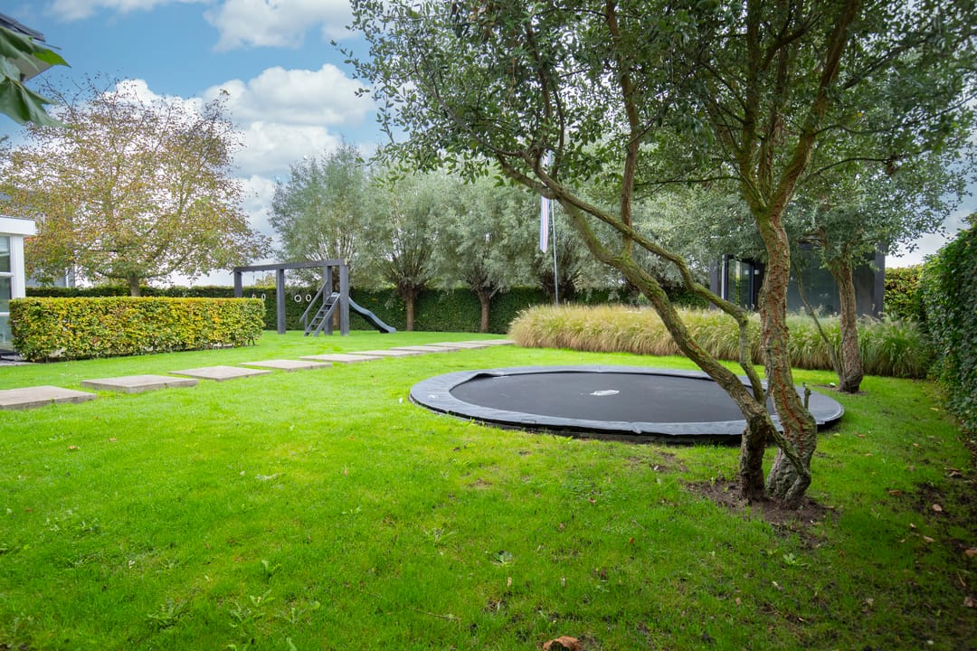 De tuin is met zorg aangelegd en vormt een heerlijke plek om te ontspannen. Er zijn meerdere terrassen, een groot gazon, een trampoline en een luxe tuinkamer met glazen wanden, perfect voor zomeravonden. Dankzij de groene erfafscheiding geniet je hier van optimale privacy en een vrij uitzicht over het aangrenzende landschap.