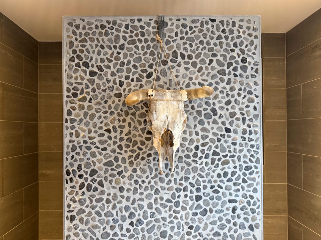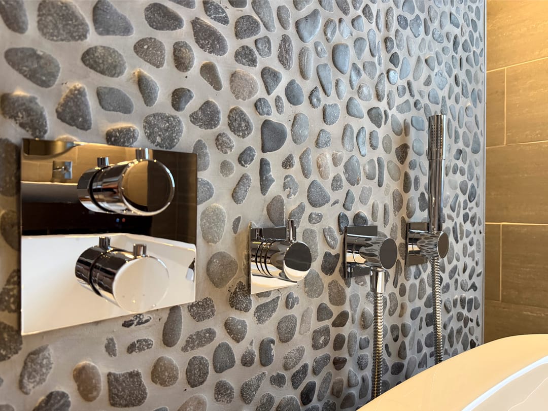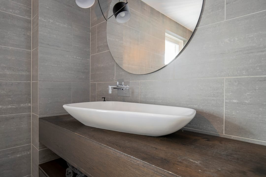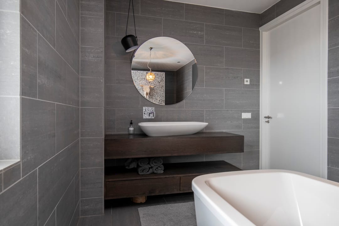 De badkamer is modern en stijlvol ingericht, voorzien van een toilet, inloopdouche, ligbad en een wastafelmeubel. De afwerking met grote grijze tegels en zwarte accenten geeft het geheel een rustige, eigentijdse uitstraling. De vloer wordt verwarmd middels een warmteterugwinsysteem, wat zorgt voor extra comfort.