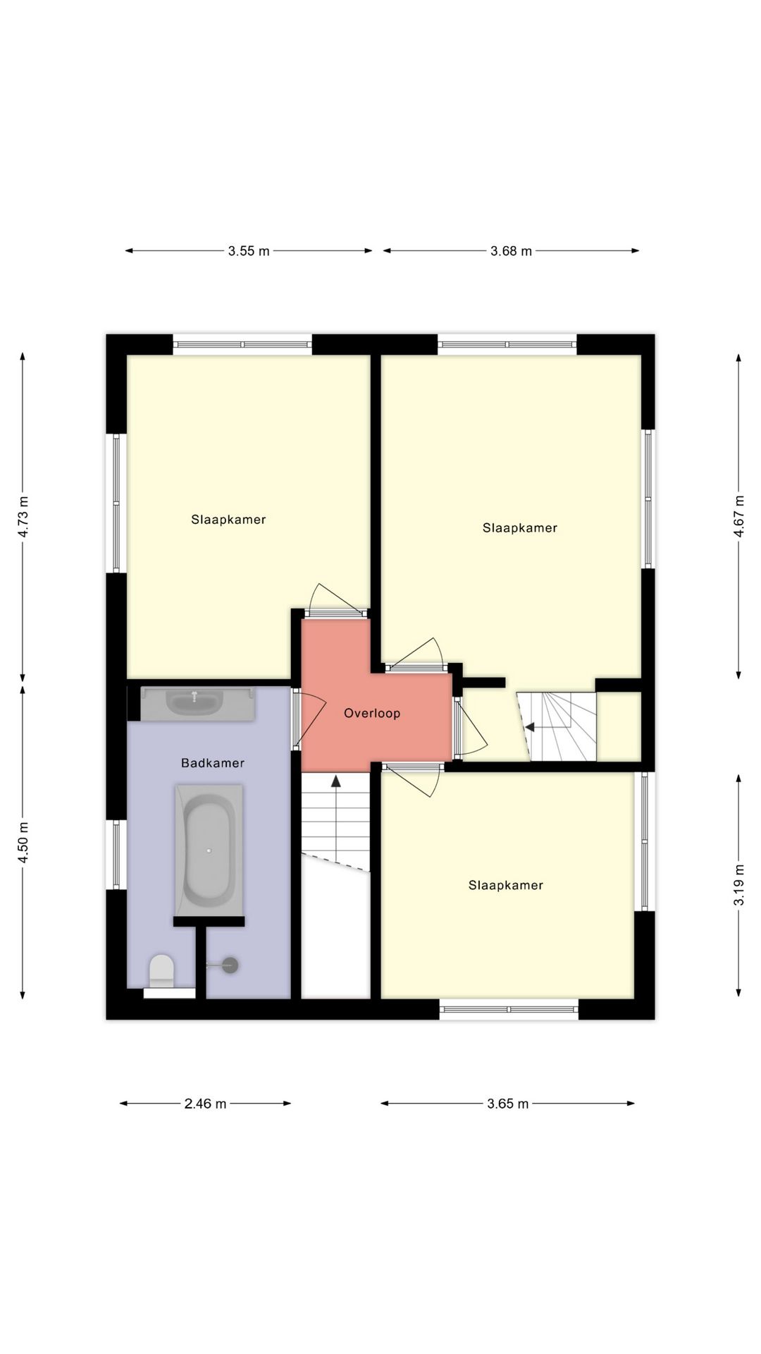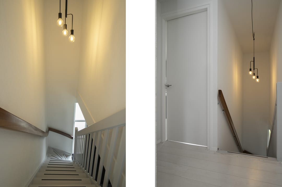 De eerste verdieping biedt drie ruime slaapkamers en een luxe badkamer. Alle slaapkamers hebben een goede afmeting en beschikken over grote ramen, wat zorgt voor veel lichtinval. In één van de kamers bevindt zich de trapopgang naar de tweede verdieping.