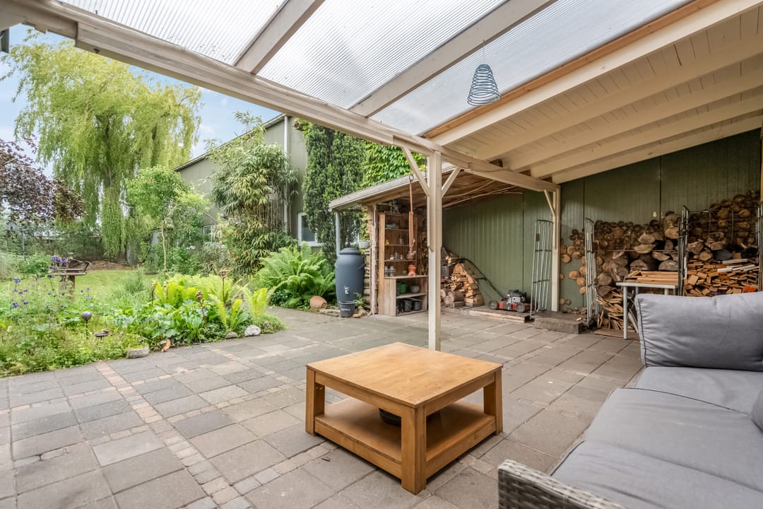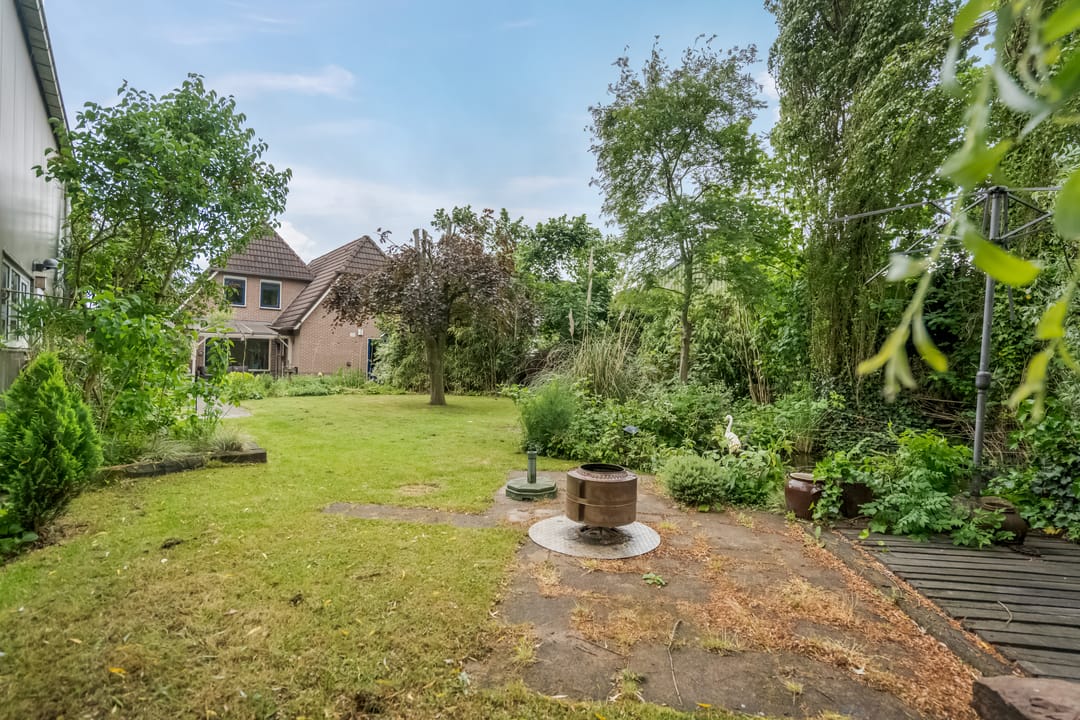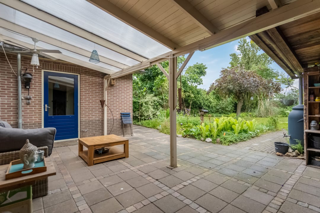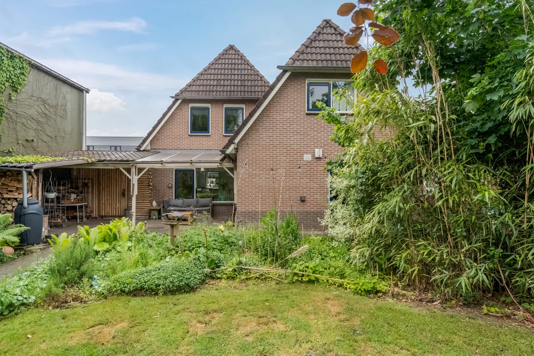 De woning wordt omringd door een groen aangelegde tuin met volwassen beplanting, fraaie aangelegde vijver met vissen en een beschutte ligging. Aan de achterzijde bevindt zich een overkapping met aansluitend een royaal terras, ideaal voor zomerse avonden in privacy. De achtertuin grenst aan het loodsperceel en biedt toegang tot deze ruimte.