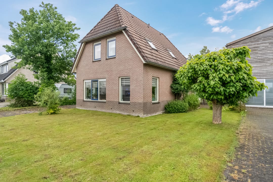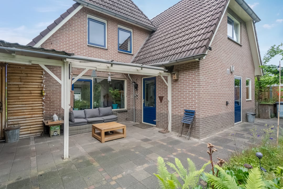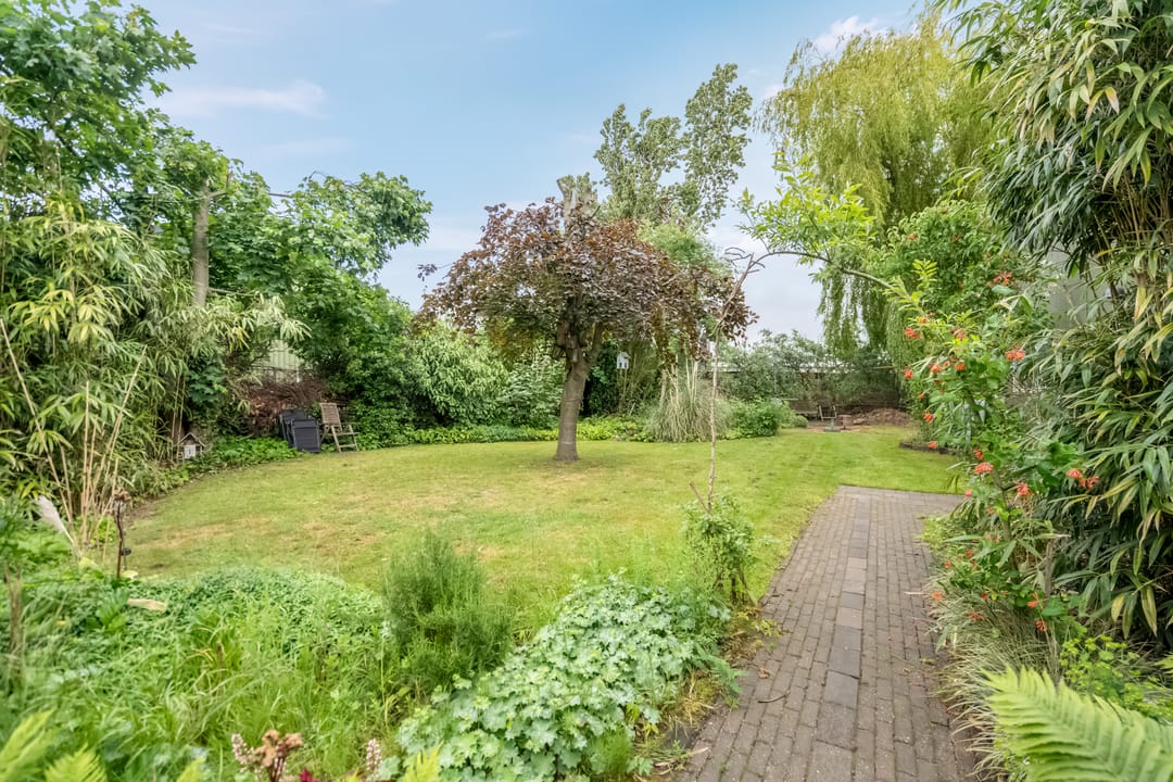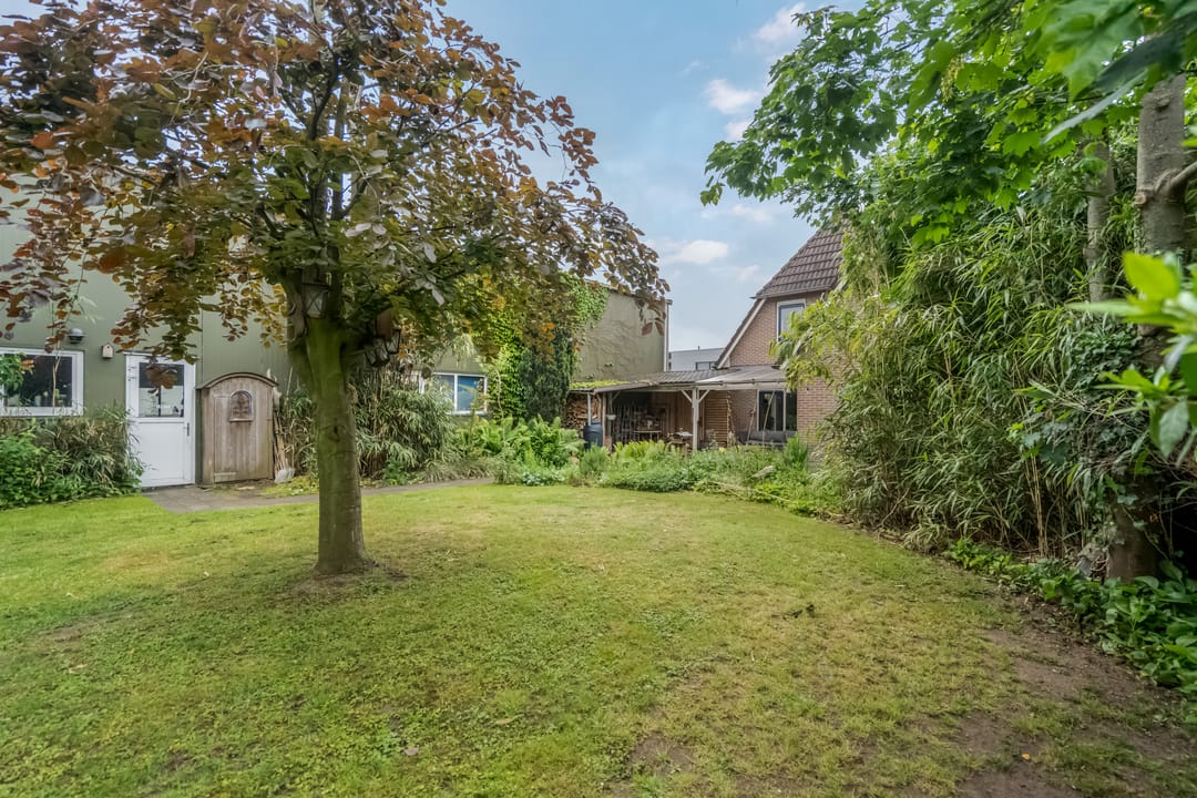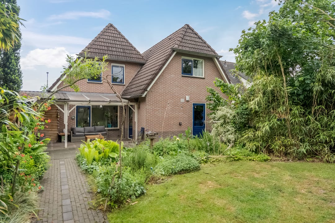 De woning wordt omringd door een groen aangelegde tuin met volwassen beplanting, fraaie aangelegde vijver met vissen en een beschutte ligging. Aan de achterzijde bevindt zich een overkapping met aansluitend een royaal terras, ideaal voor zomerse avonden in privacy. De achtertuin grenst aan het loodsperceel en biedt toegang tot deze ruimte.