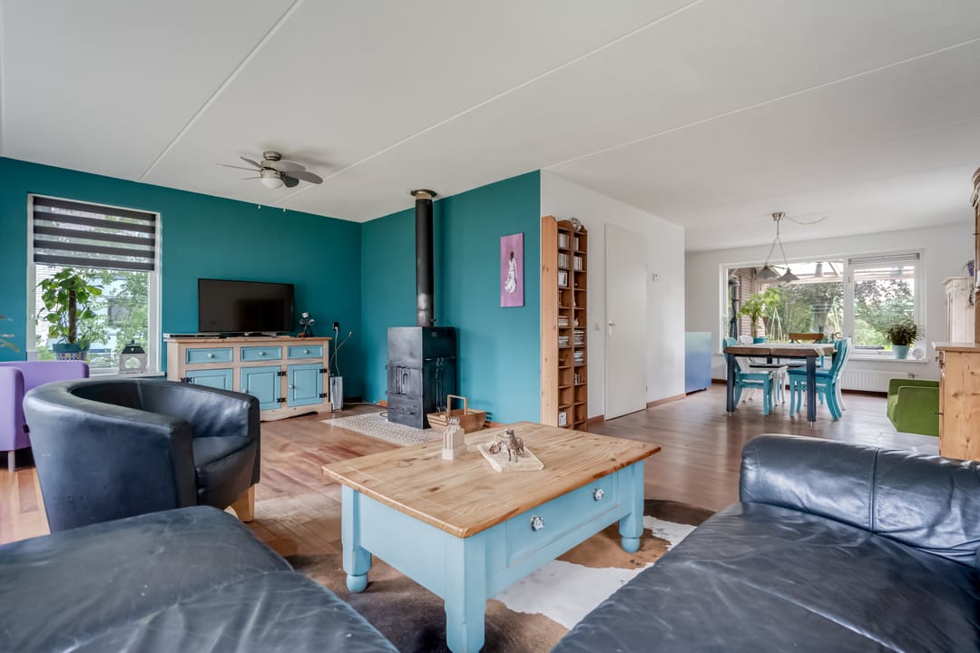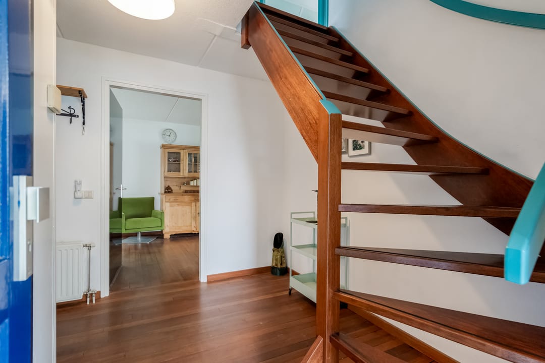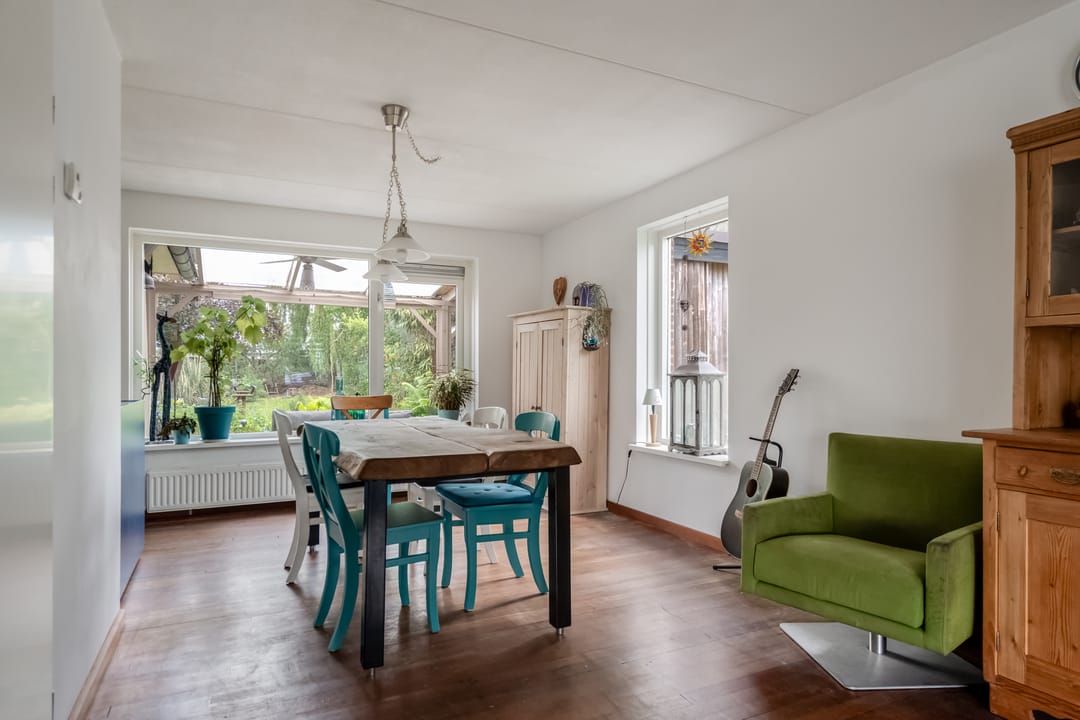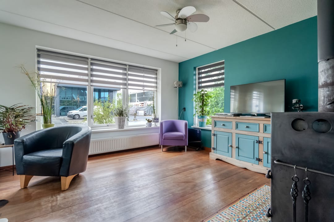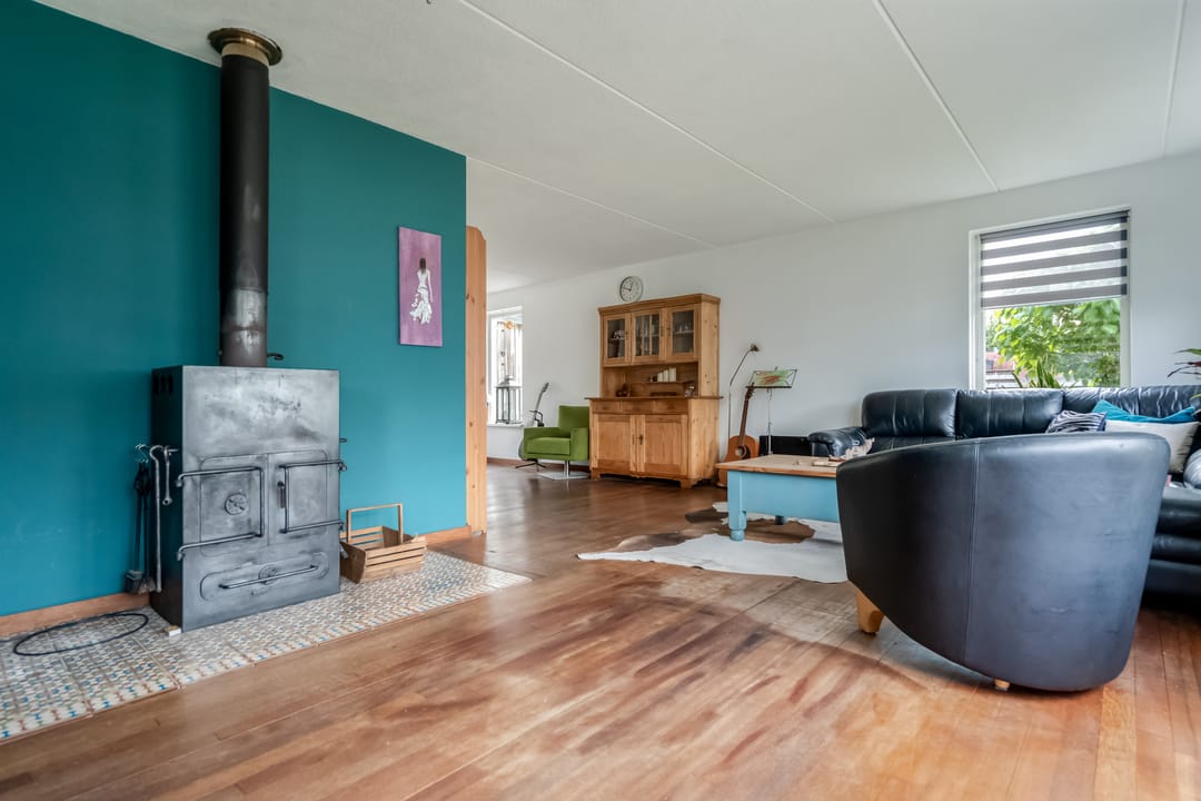 Via de overdekte entree komt u in de hal met trapopgang, vernieuwd toilet (2023), meterkast (met krachtstroom en water) en toegang tot de lichte, straatgerichte woonkamer van ca. 23 m². Deze kamer is dankzij de rondom geplaatste ramen opvallend licht en voelt ruim aan. De houten vloer geeft het geheel een warme uitstraling, en de sfeervolle houtkachel zorgt voor extra behaaglijkheid in de koudere maanden.