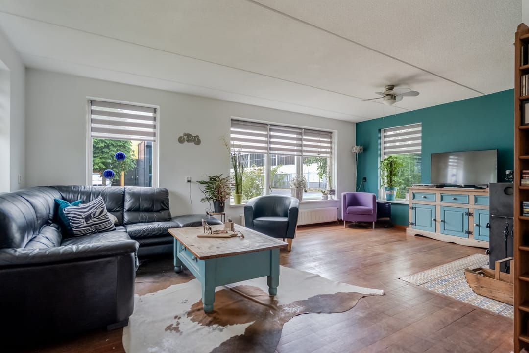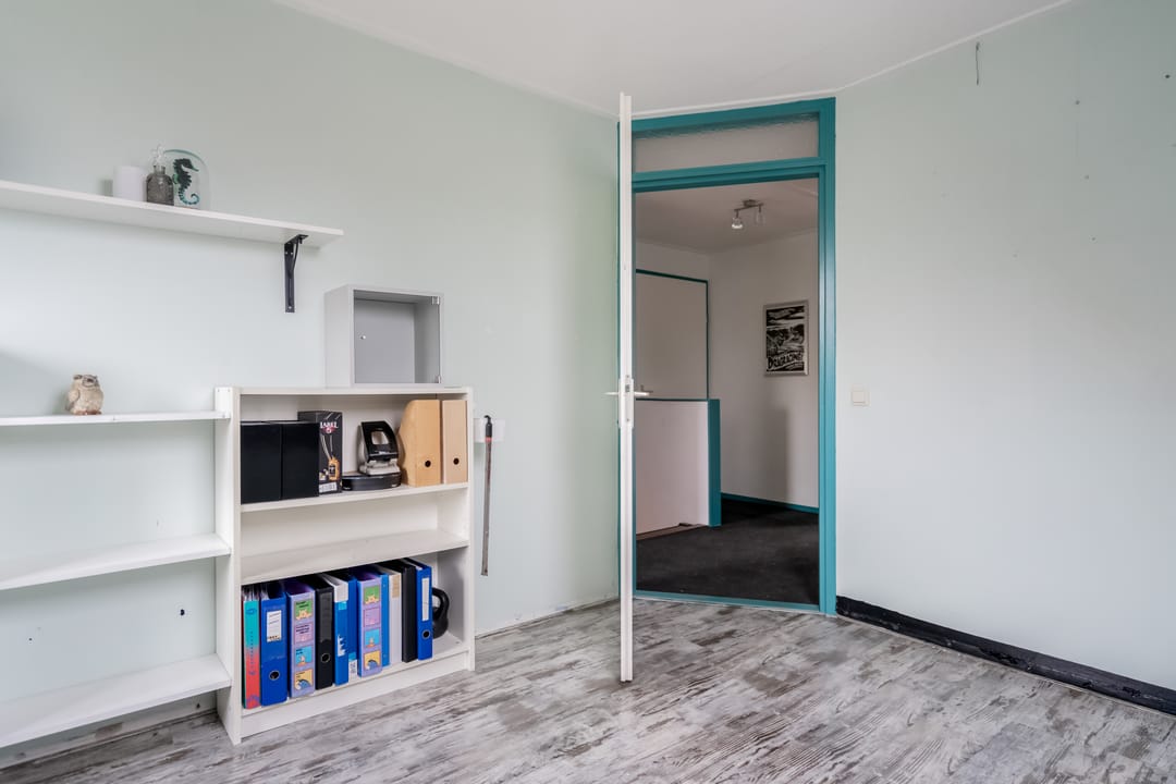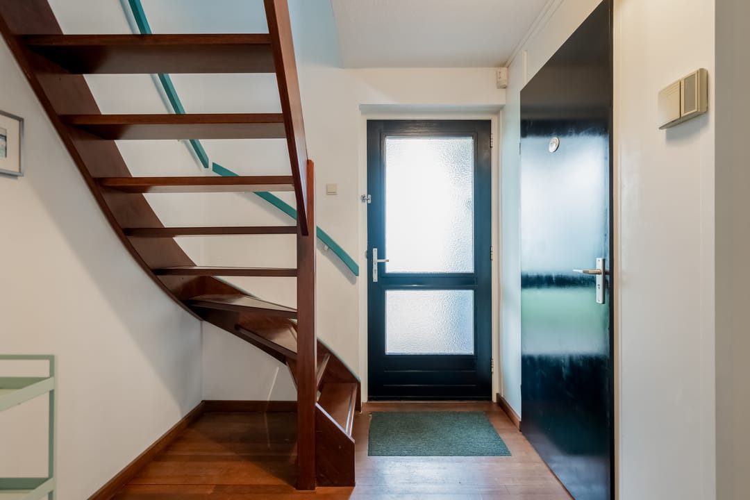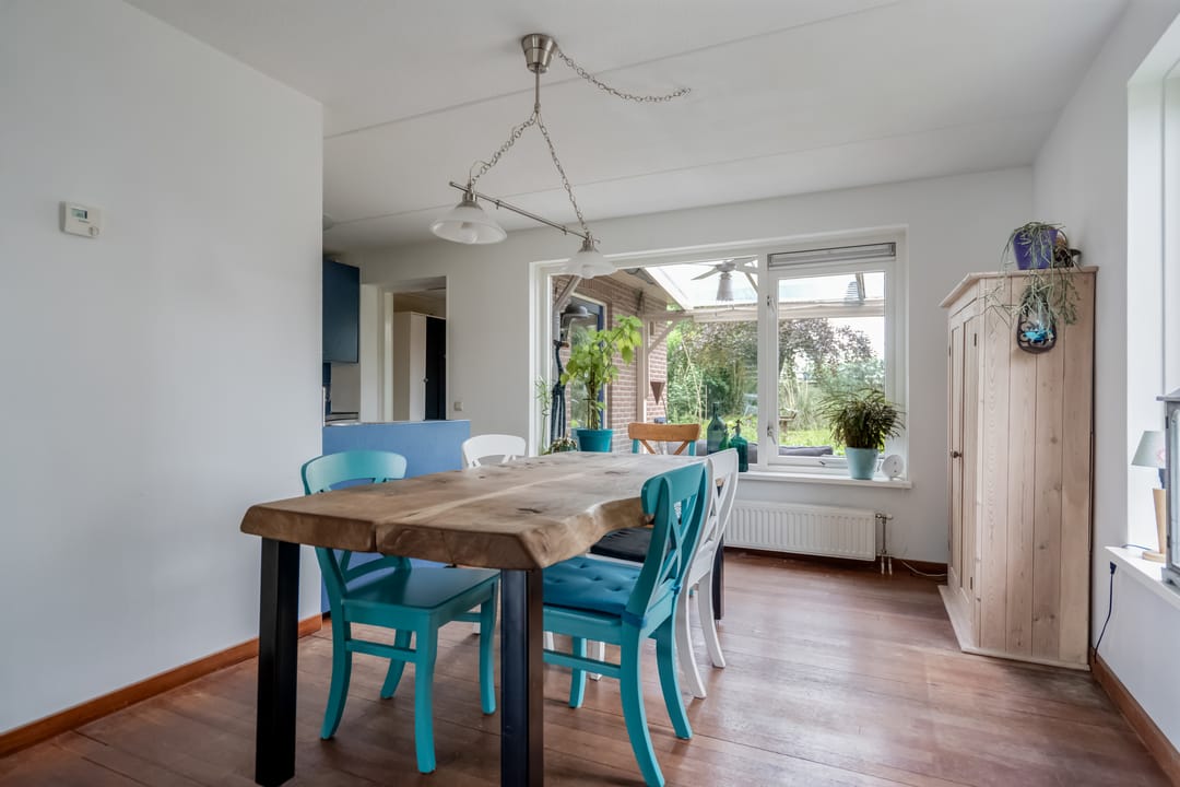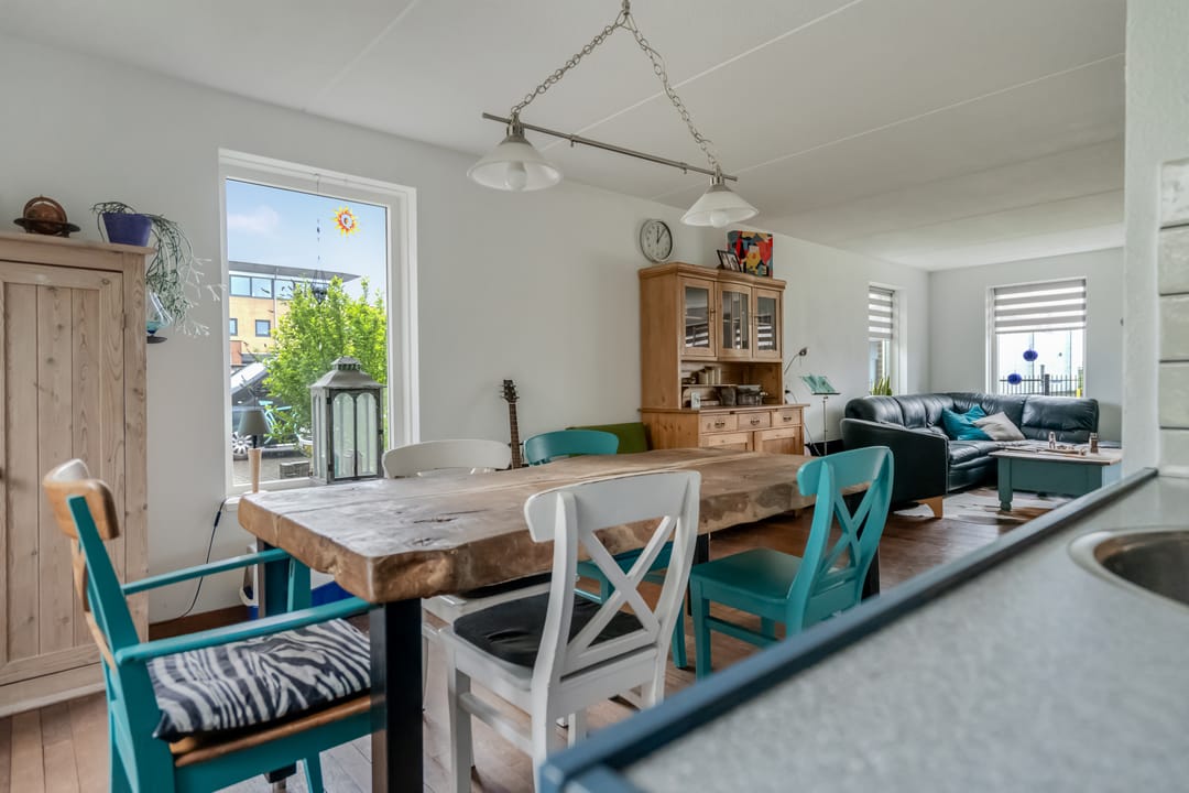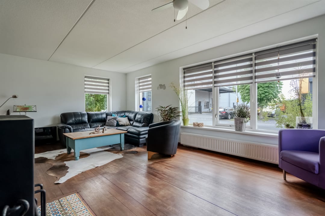 Via de overdekte entree komt u in de hal met trapopgang, vernieuwd toilet (2023), meterkast (met krachtstroom en water) en toegang tot de lichte, straatgerichte woonkamer van ca. 23 m². Deze kamer is dankzij de rondom geplaatste ramen opvallend licht en voelt ruim aan. De houten vloer geeft het geheel een warme uitstraling, en de sfeervolle houtkachel zorgt voor extra behaaglijkheid in de koudere maanden.