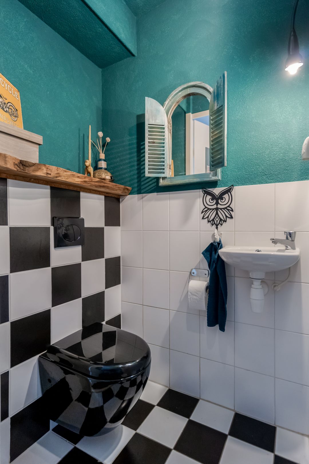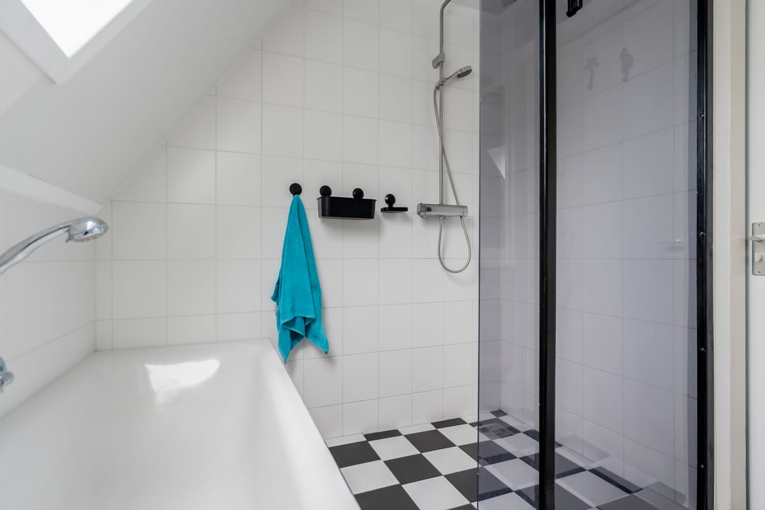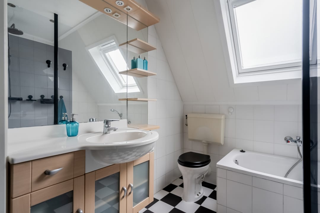De badkamer is praktisch ingedeeld en voorzien van een douche, ligbad, toilet, wastafelmeubel en een dakraam voor natuurlijke ventilatie.