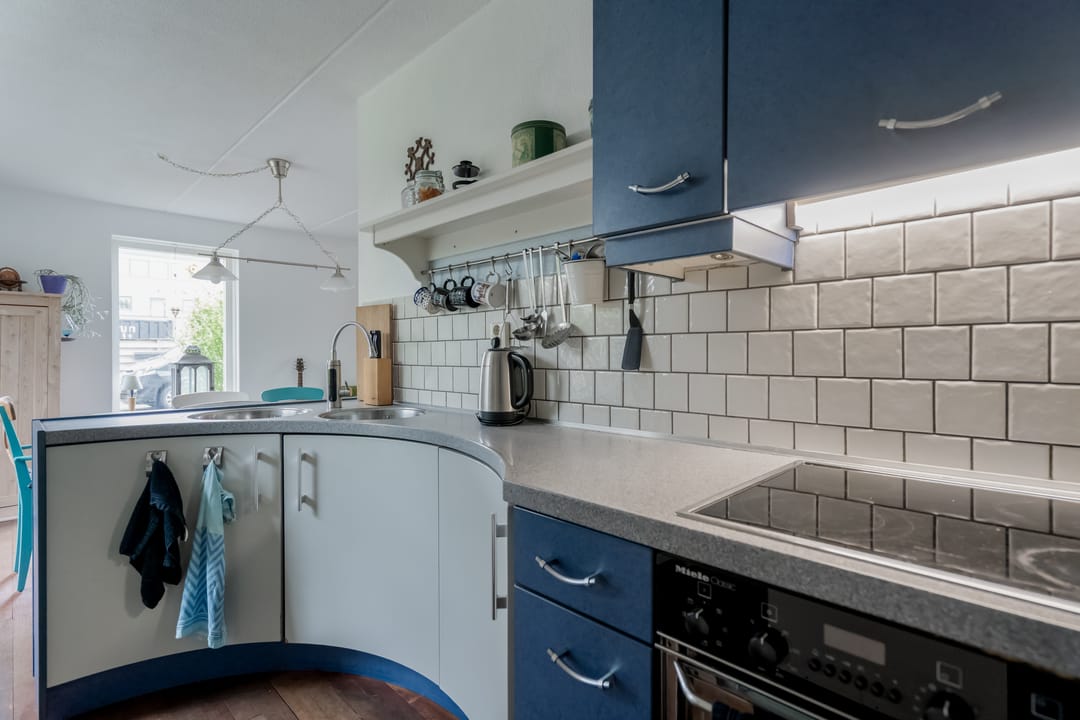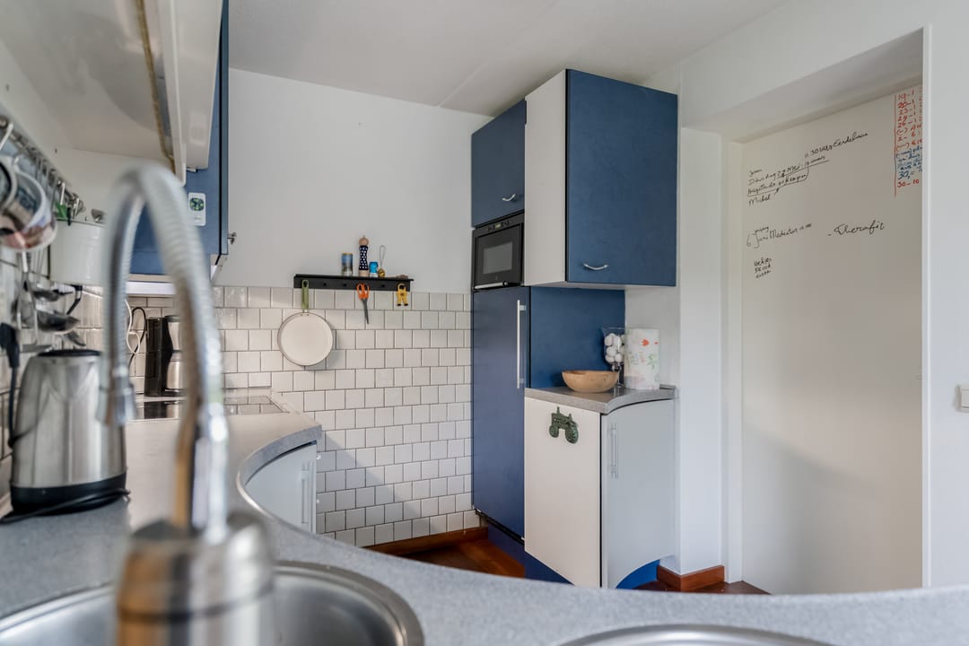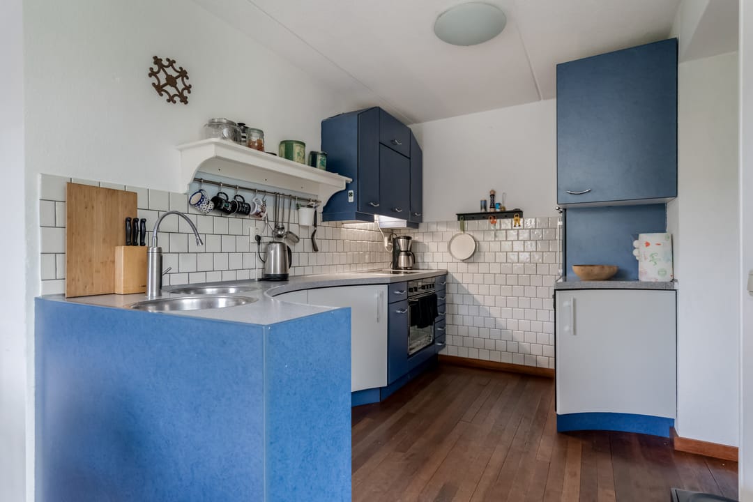 De keuken, uitgevoerd in L-vorm, grenst direct aan de woonkamer en is voorzien van Miele inbouwapparatuur: elektrische kookplaat, afzuigkap, combi-oven en koelkast. Aansluitend bevindt zich de bijkeuken, uitgerust met extra kastruimte en witgoedaansluiting. De bijkeuken biedt toegang tot de inpandige garage, waarmee het comfort van binnendoor bereik vergroot wordt.